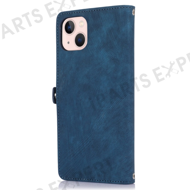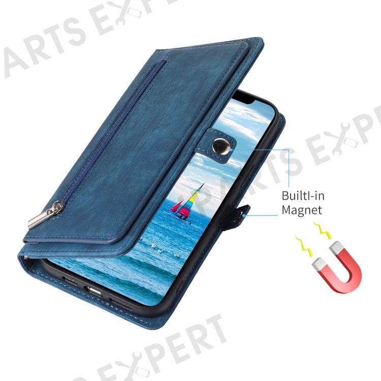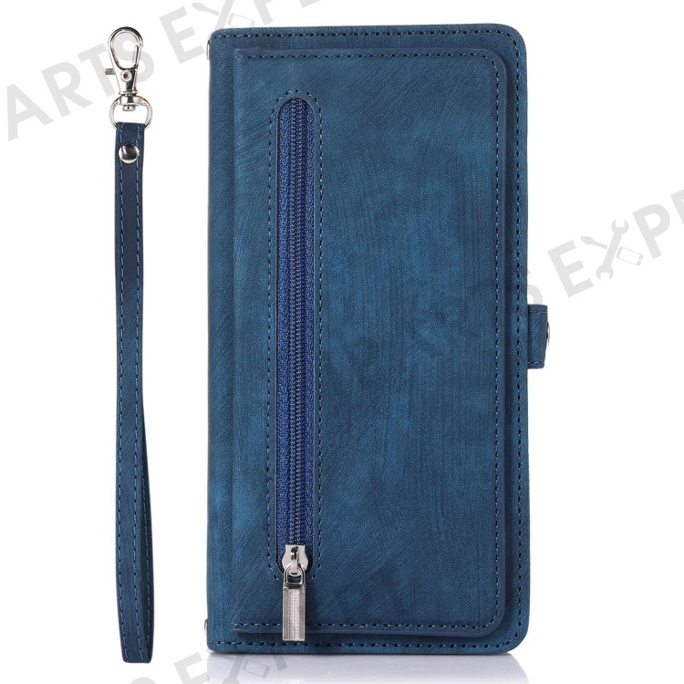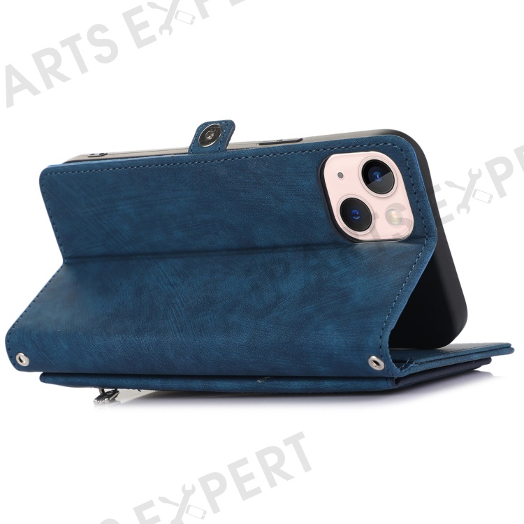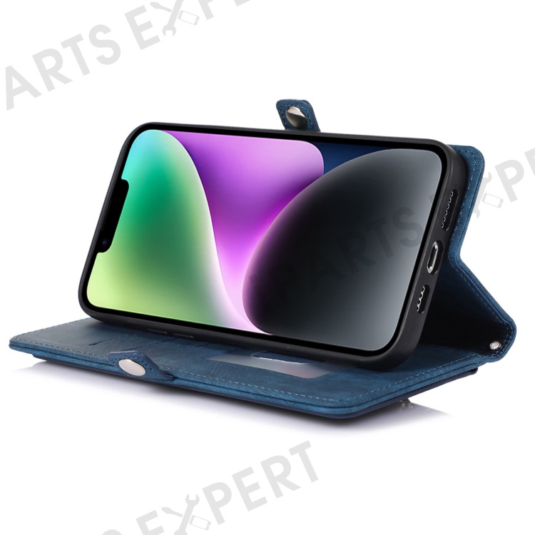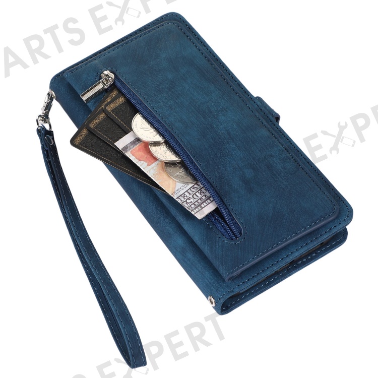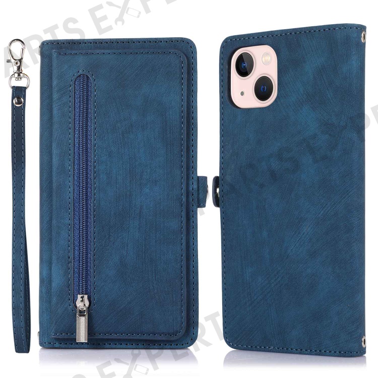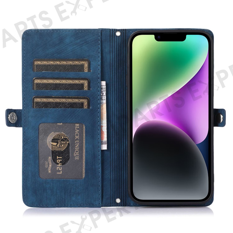 For iPhone 14 6.1 inch Zipper Pocket Design 9 Card Slots Phone Wallet Case PU Leather Stand Shockproof Cover with Wrist Strap - Blue