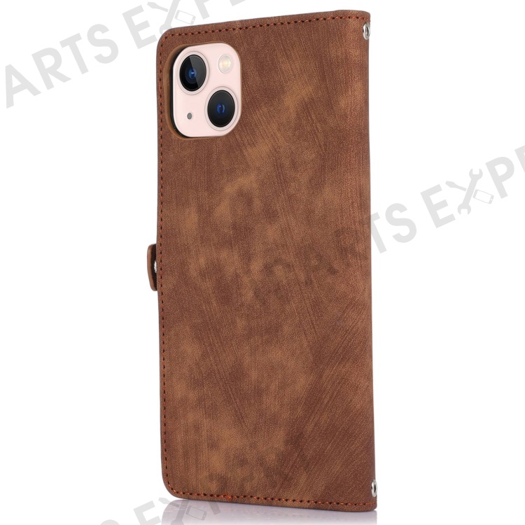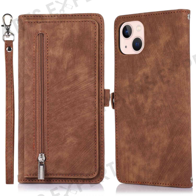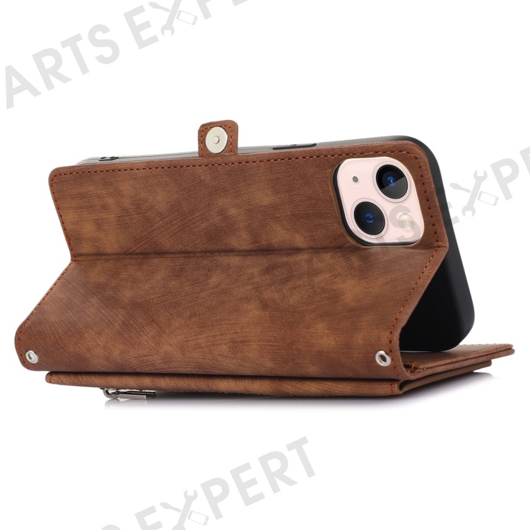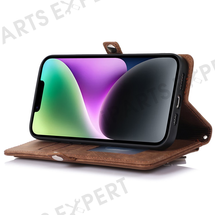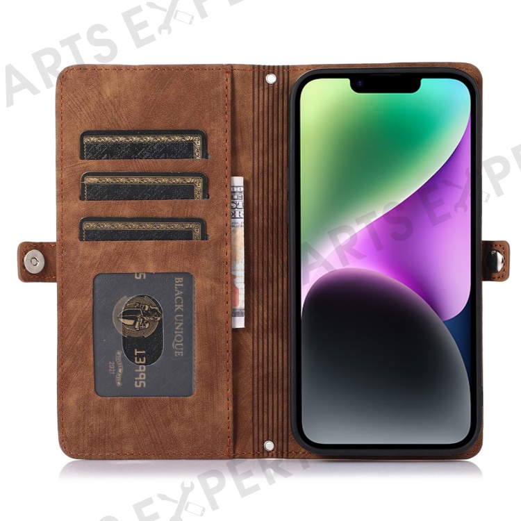For iPhone 14 6.1 inch Zipper Pocket Design 9 Card Slots Phone Wallet Case PU Leather Stand Shockproof Cover with Wrist Strap - Brown