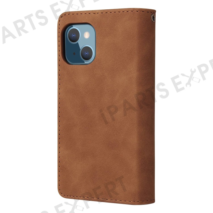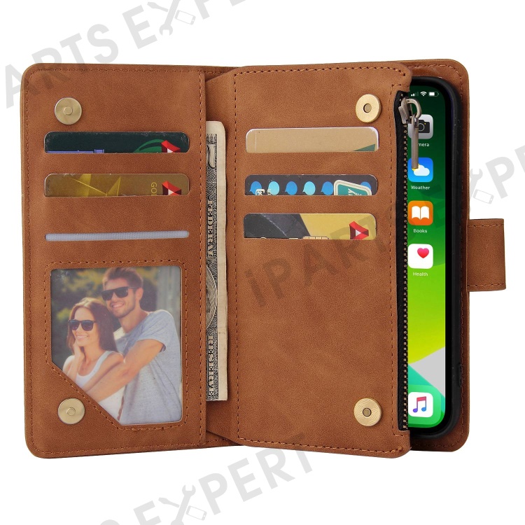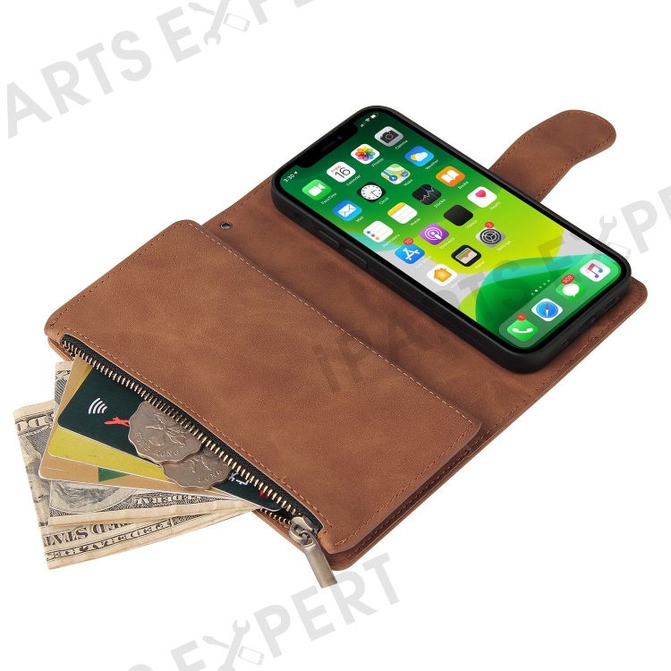 For iPhone 14 6.1 inch Zipper Pocket Design PU Leather Anti-drop Phone Cover Multiple Card Slots Wallet Stand Protective Case - Brown