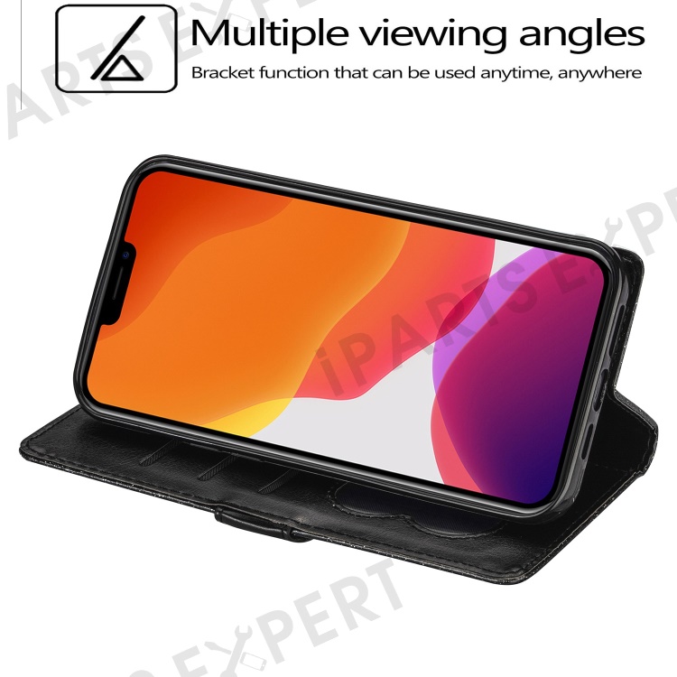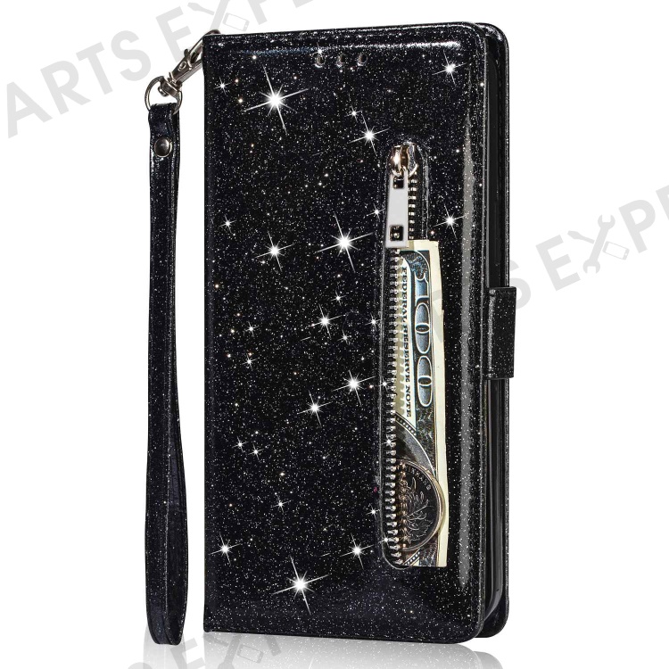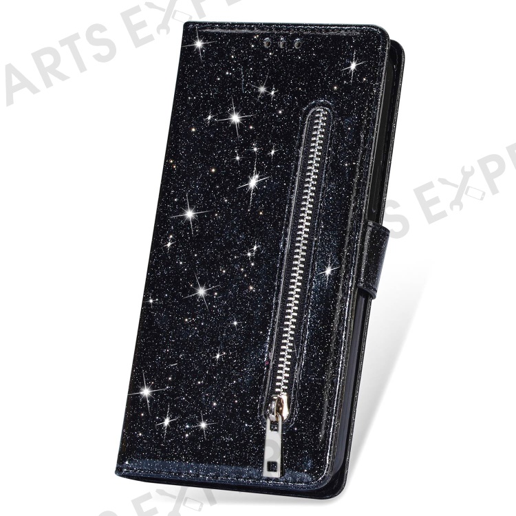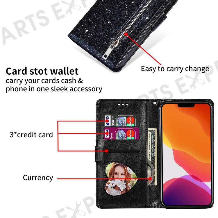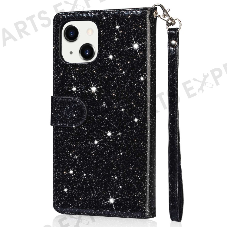 For iPhone 14 6.1 inch Zipper Pocket Glittery PU Leather Case Wallet Stand Magnetic Clasp Anti-fall Phone Cover - Black