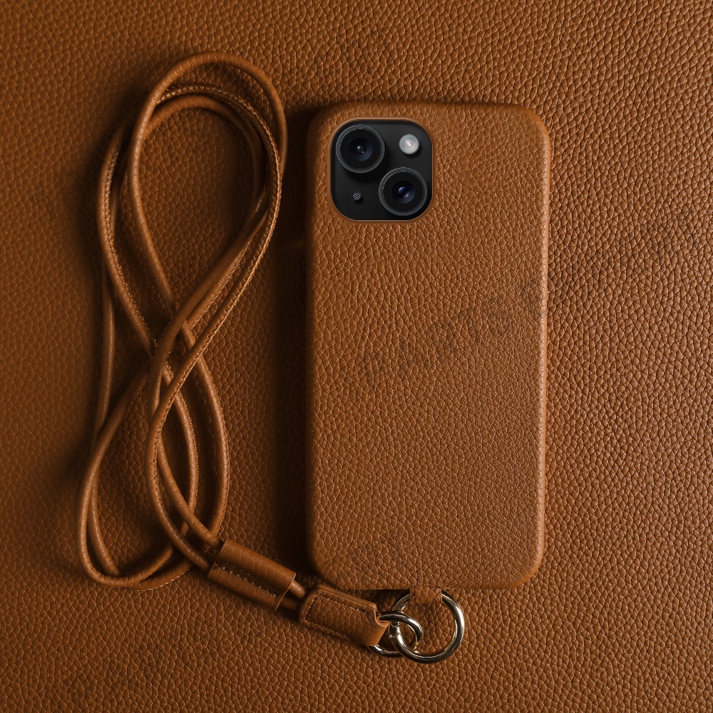 For iPhone 14 Case with Lanyard Genuine Cow Leather PC Phone Back Cover - Brown