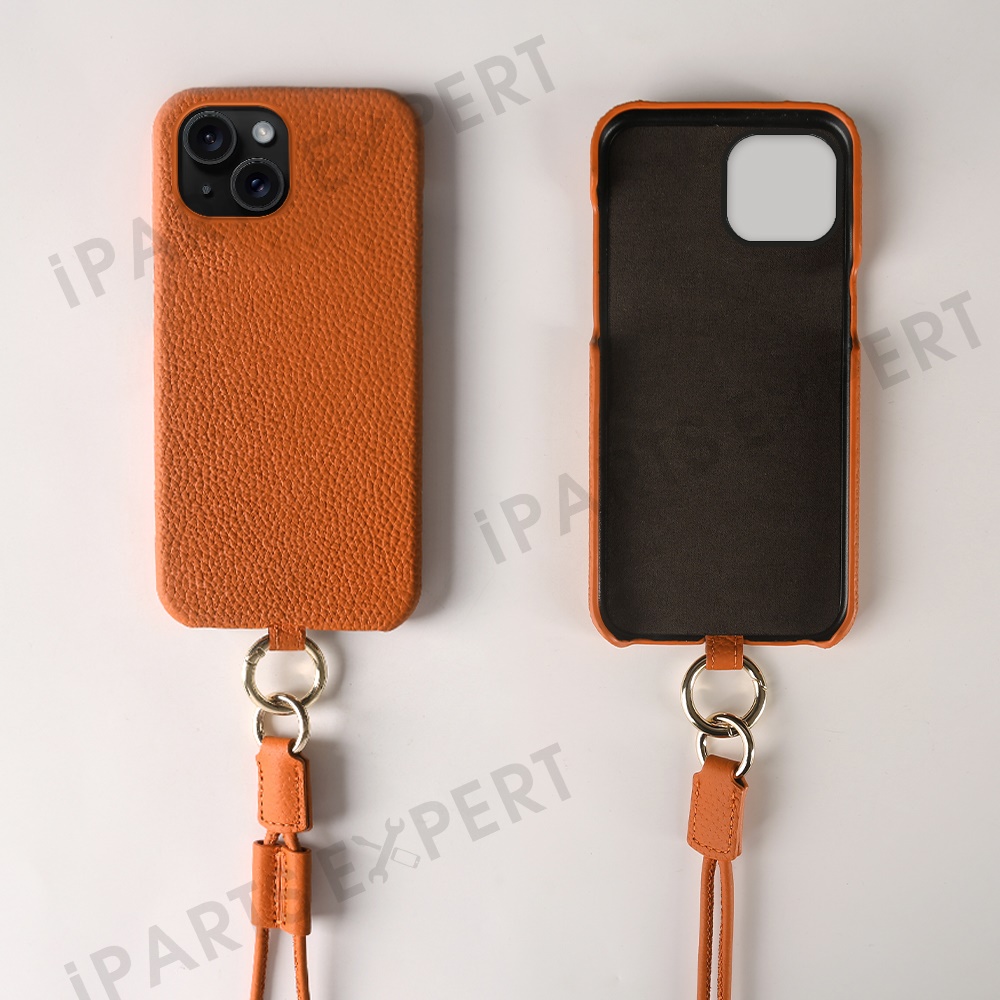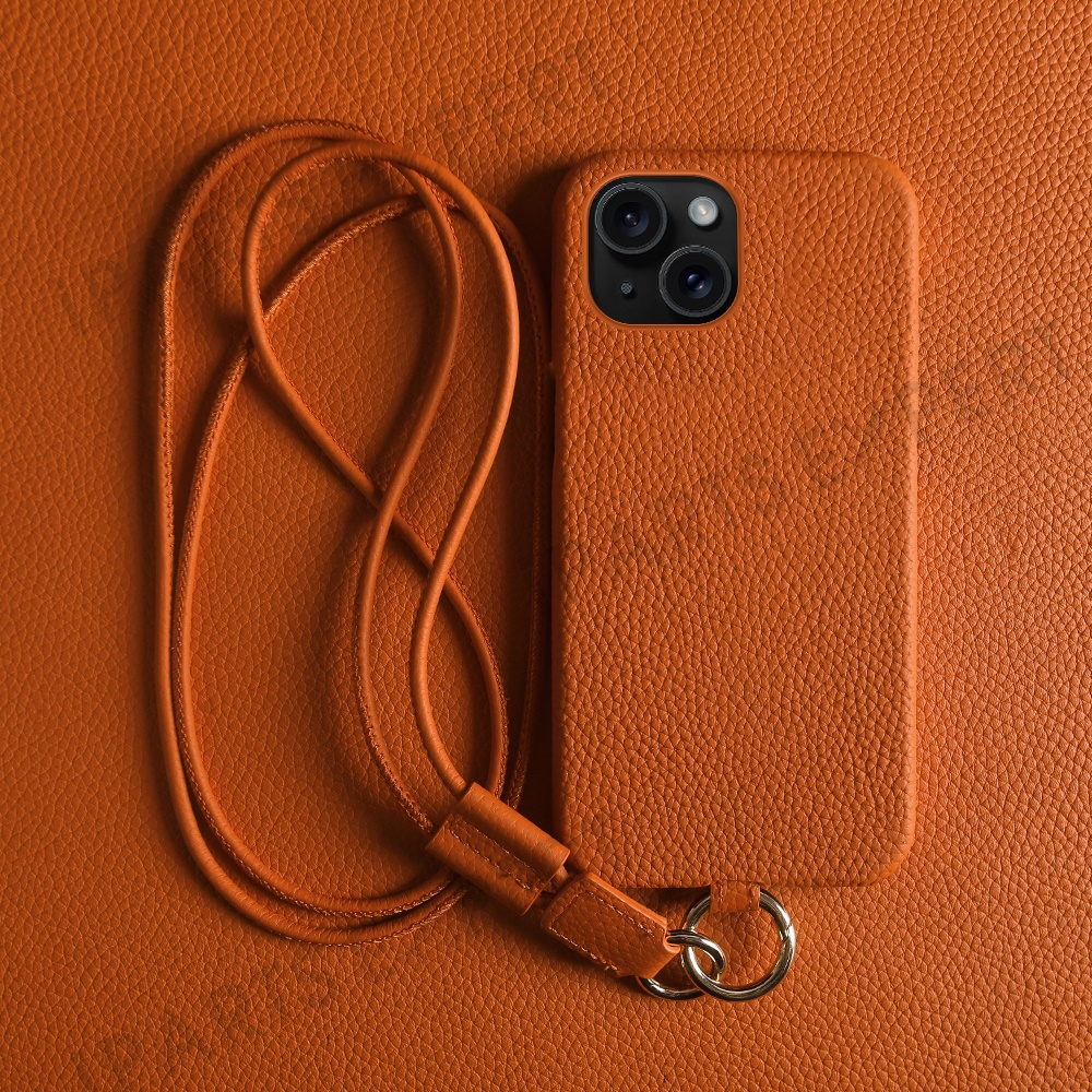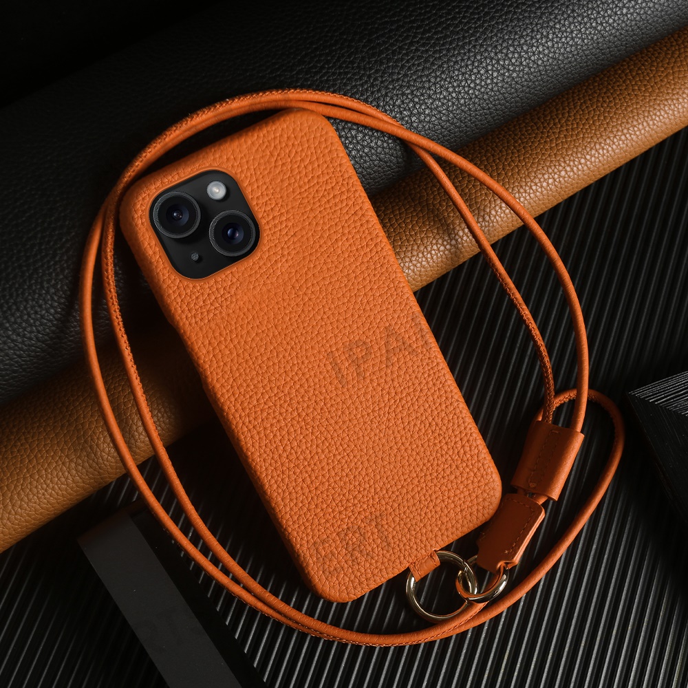 For iPhone 14 Case with Lanyard Genuine Cow Leather PC Phone Back Cover - Orange