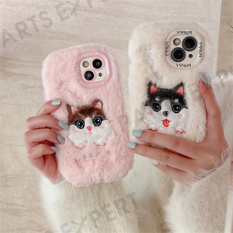 For iPhone 14 Cell Phone Case Plush Cartoon Animal Embroidery TPU Cover - Puppy
