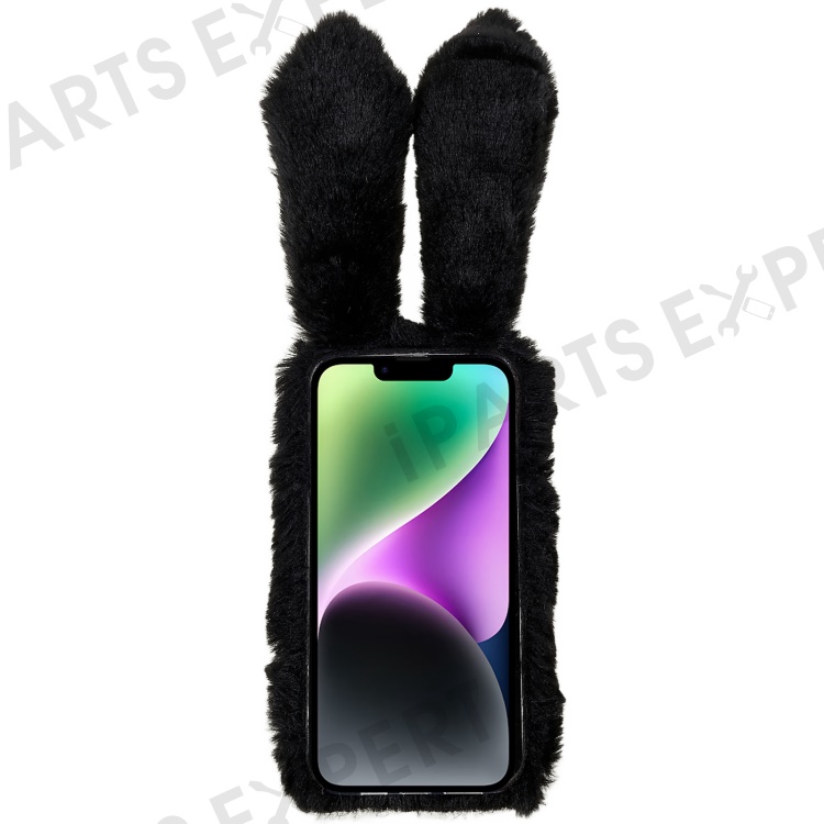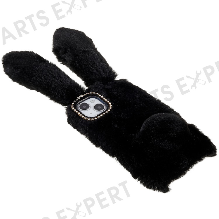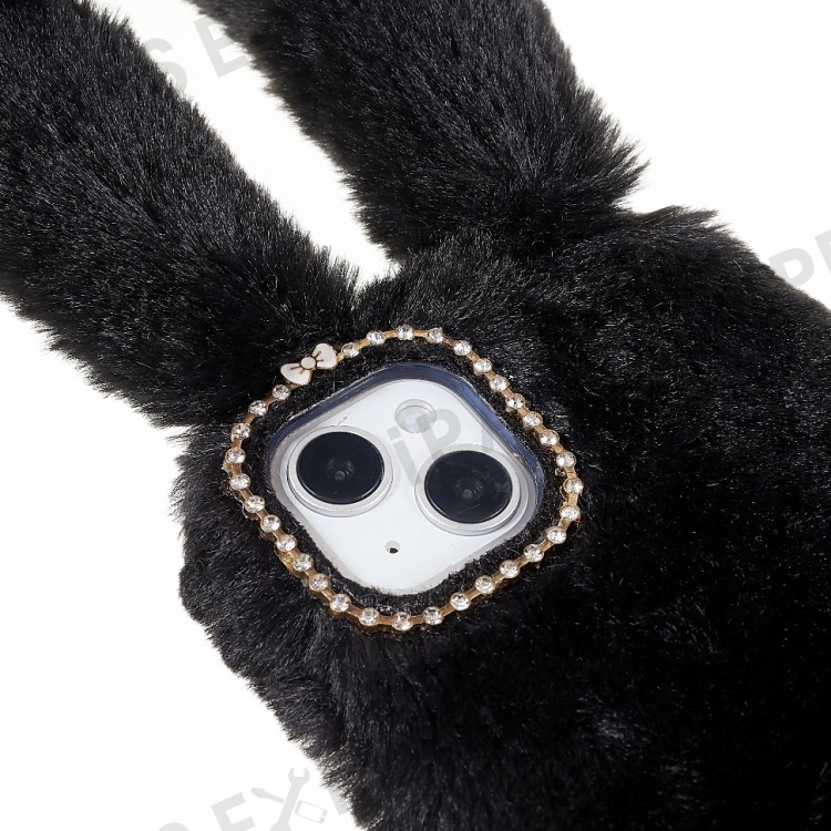 For iPhone 14 Cute 3D Bunny Ears Furry Winter Warm Case Collision Resistant TPU Protective Phone Cover with Glitter Rhinestone Bowknot - Black