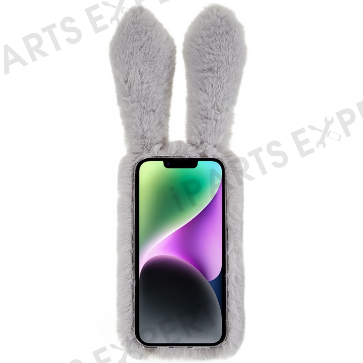 For iPhone 14 Cute 3D Bunny Ears Furry Winter Warm Case Collision Resistant TPU Protective Phone Cover with Glitter Rhinestone Bowknot - Light Grey