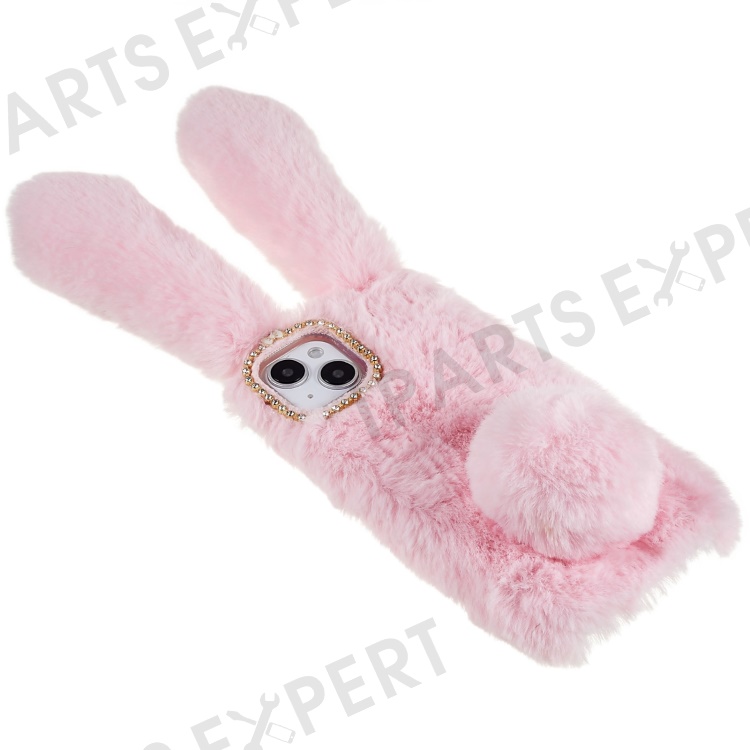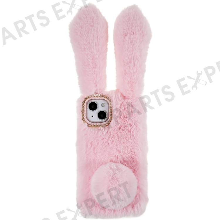 For iPhone 14 Cute 3D Bunny Ears Furry Winter Warm Case Collision Resistant TPU Protective Phone Cover with Glitter Rhinestone Bowknot - Pink