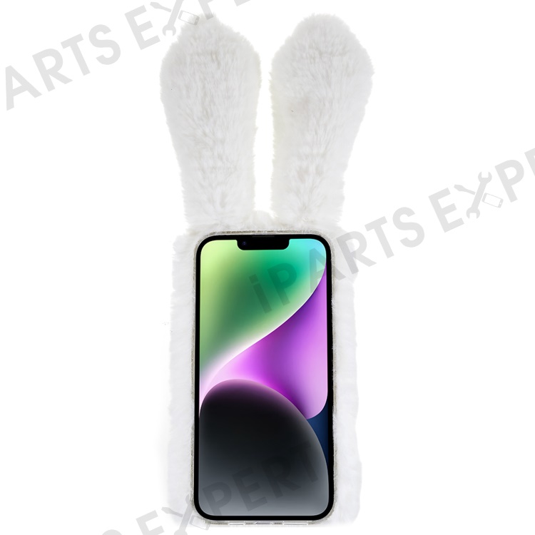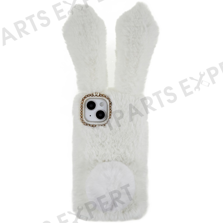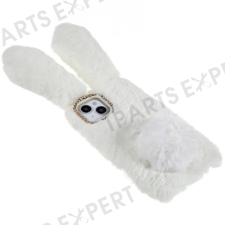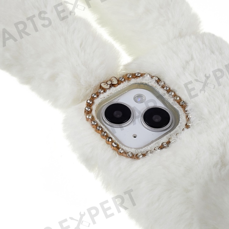 For iPhone 14 Cute 3D Bunny Ears Furry Winter Warm Case Collision Resistant TPU Protective Phone Cover with Glitter Rhinestone Bowknot - White