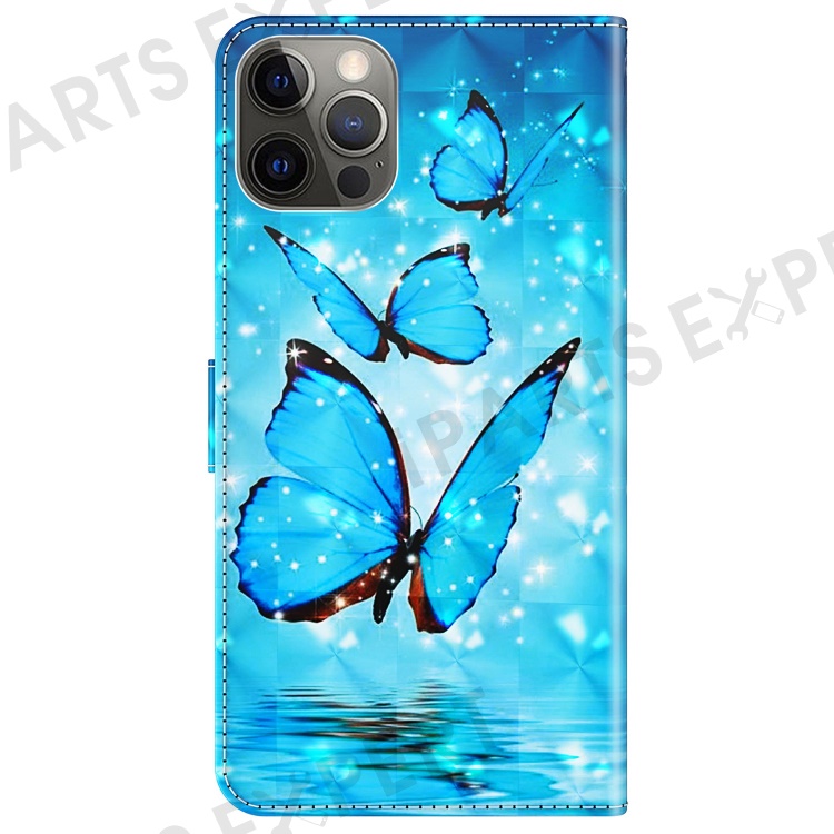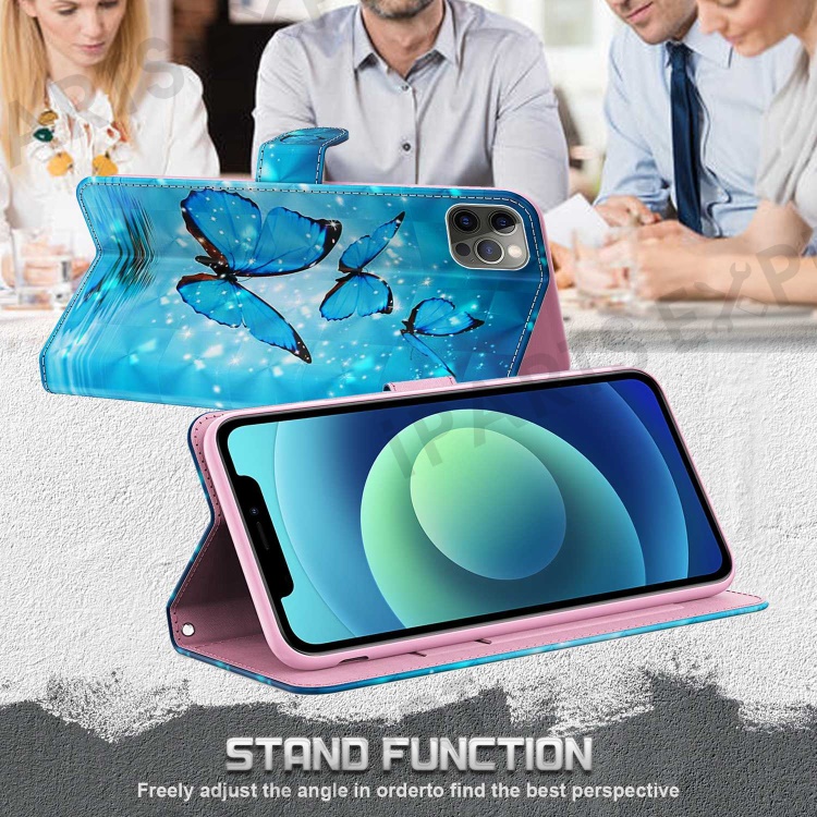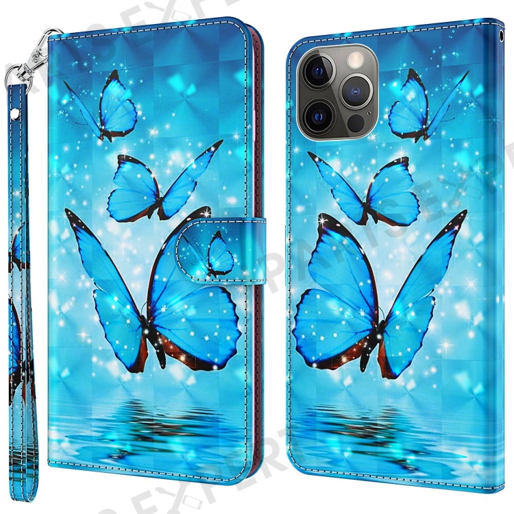For iPhone 14 Plus 6.7 inch Anti-fall PU Leather Phone Case Stand 3D Pattern Printed Magnet Closure Wallet Shockproof Phone Cover with Strap - Blue Butterflies