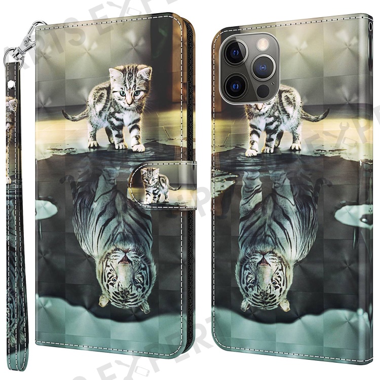 For iPhone 14 Plus 6.7 inch Anti-fall PU Leather Phone Case Stand 3D Pattern Printed Magnet Closure Wallet Shockproof Phone Cover with Strap - Cat / Tiger
