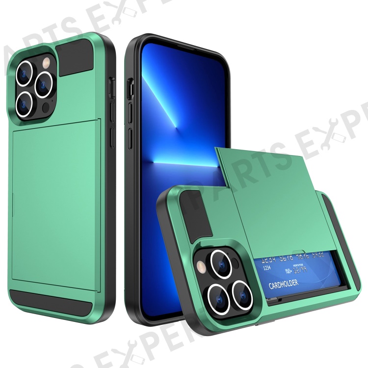 For iPhone 14 Plus 6.7 inch Drop-proof Phone Case PC + TPU Scratch-resistant Mobile Phone Cover with Sliding Card Slot - Mint Green