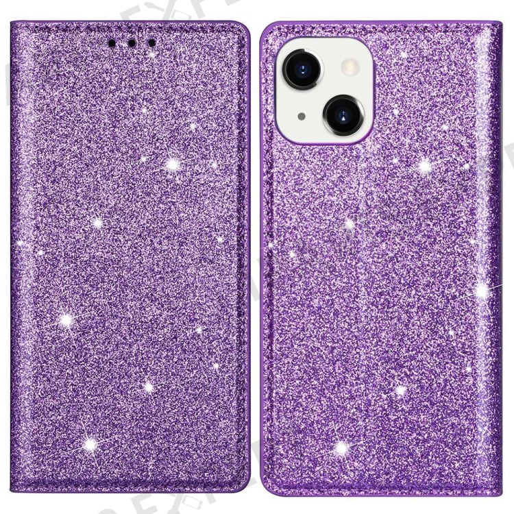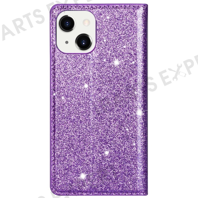 For iPhone 14 Plus 6.7 inch Glitter Sequins Stand Card Holder PU Leather Fall Proof Protective Phone Case Cover - Purple