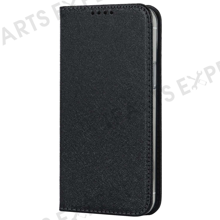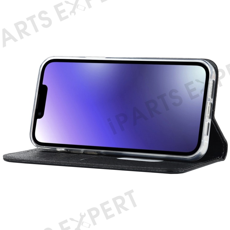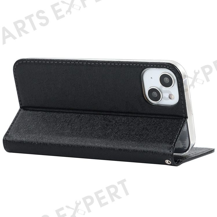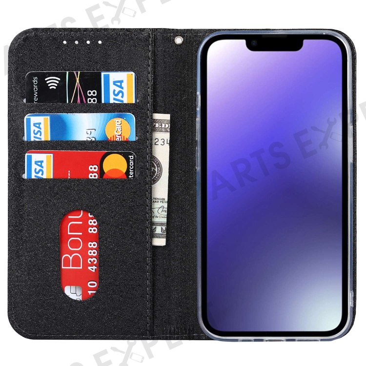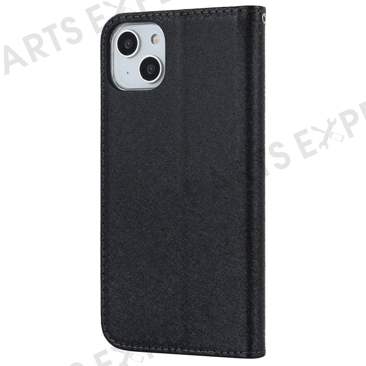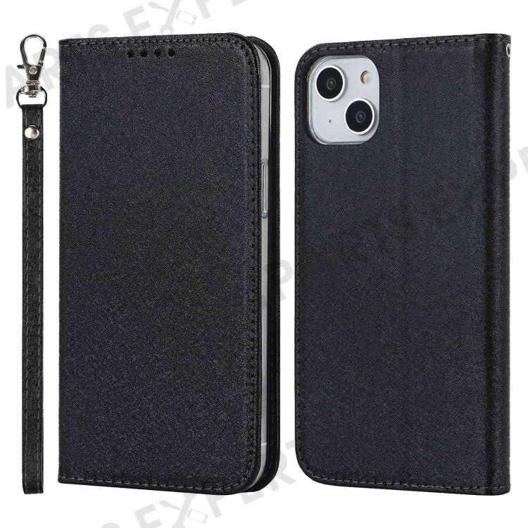 For iPhone 14 Plus PU Leather Silk Texture Anti-drop Wallet Phone Case Stand All-around Protection Cover with Wrist Strap - Black