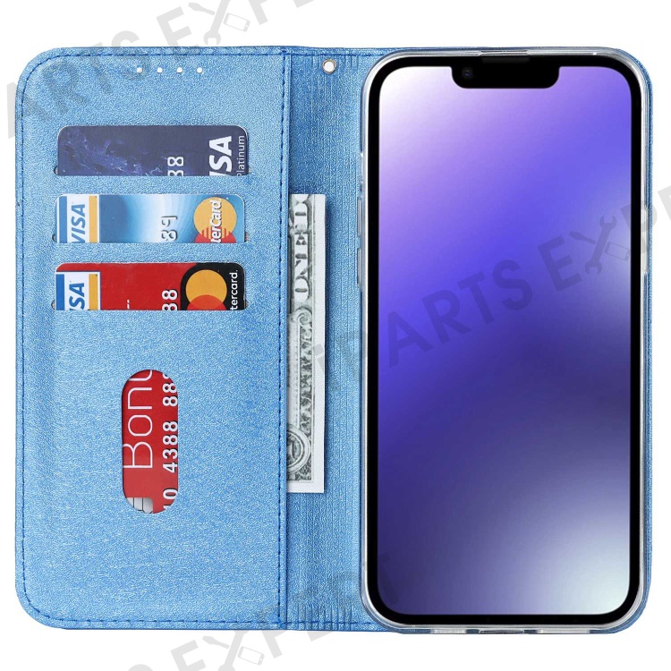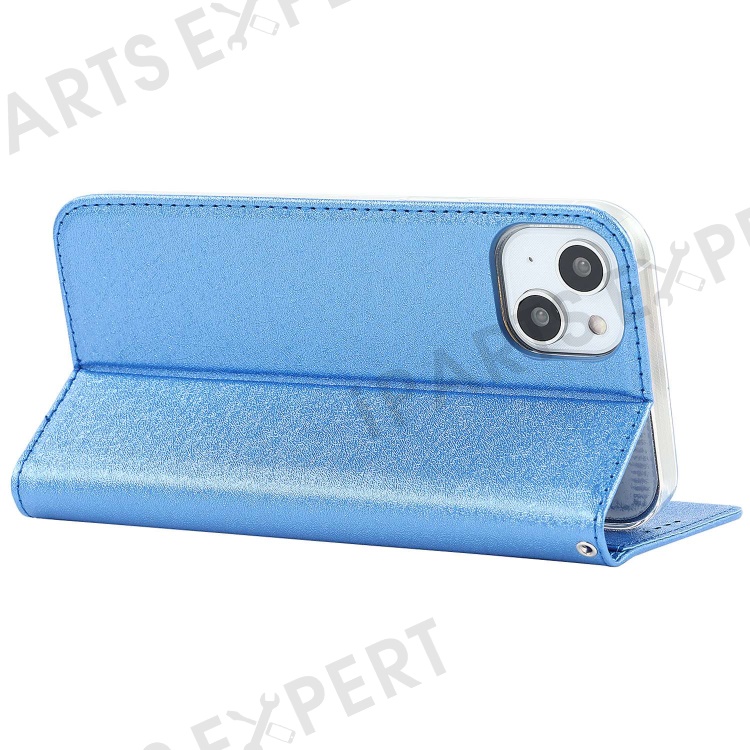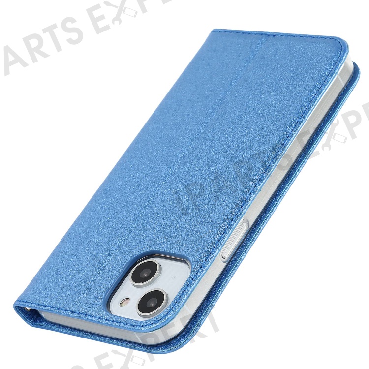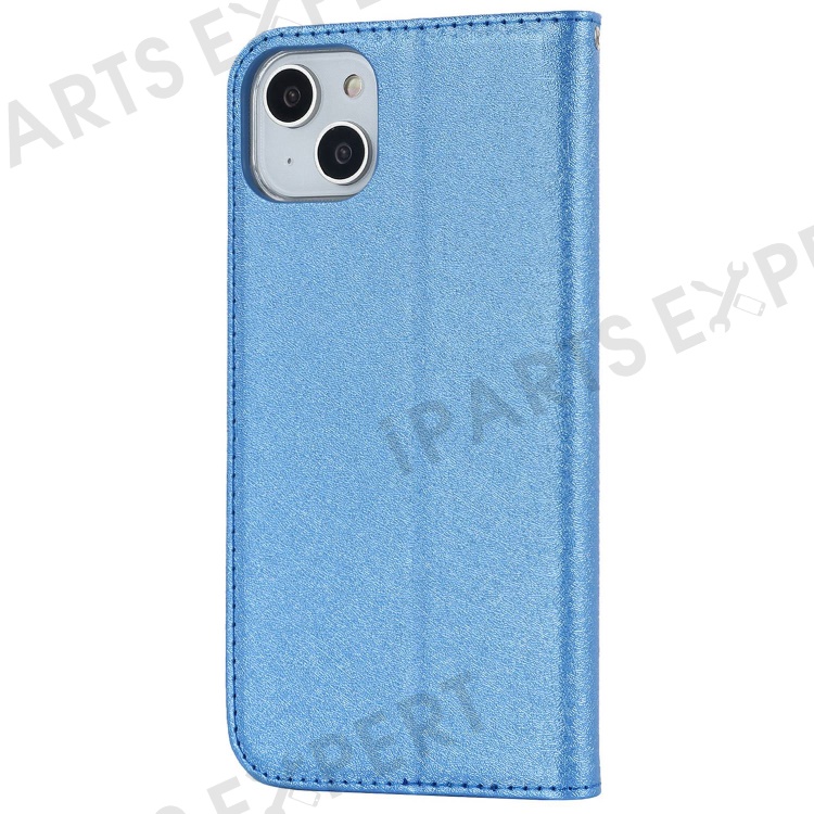 For iPhone 14 Plus PU Leather Silk Texture Anti-drop Wallet Phone Case Stand All-around Protection Cover with Wrist Strap - Blue