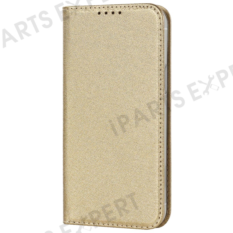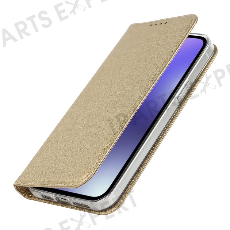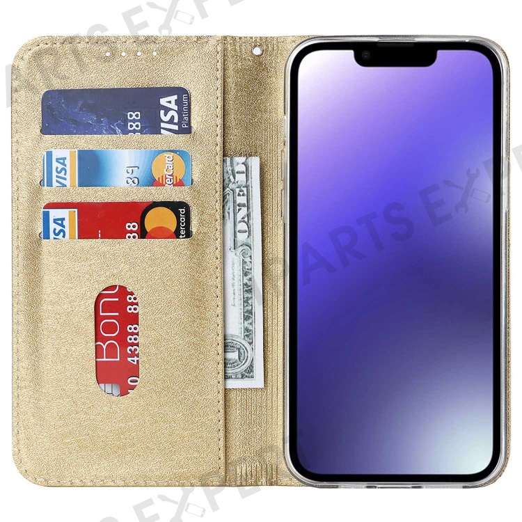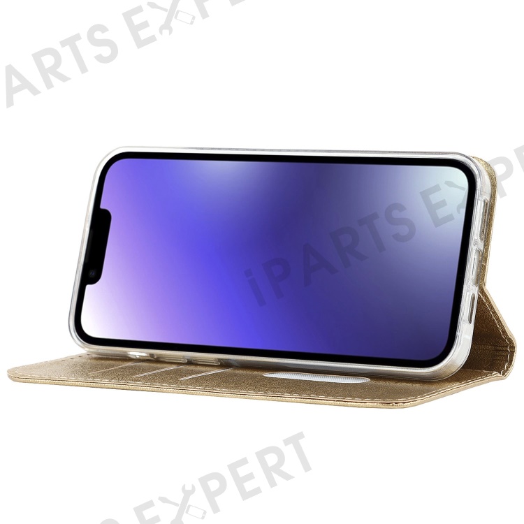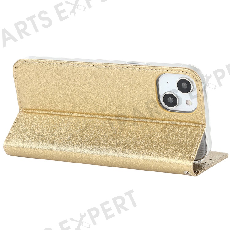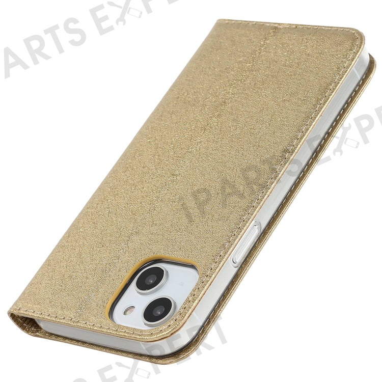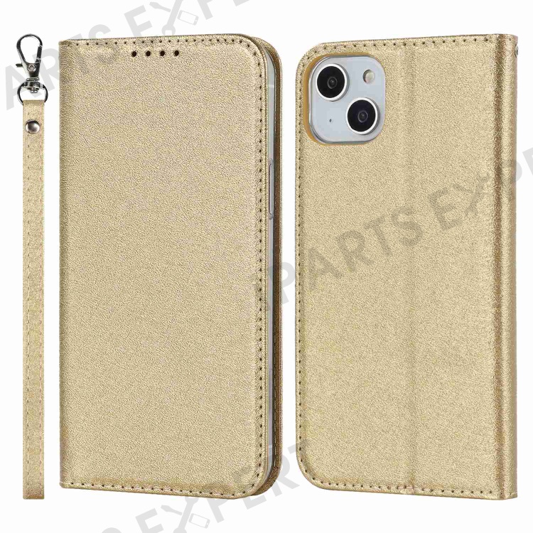 For iPhone 14 Plus PU Leather Silk Texture Anti-drop Wallet Phone Case Stand All-around Protection Cover with Wrist Strap - Gold