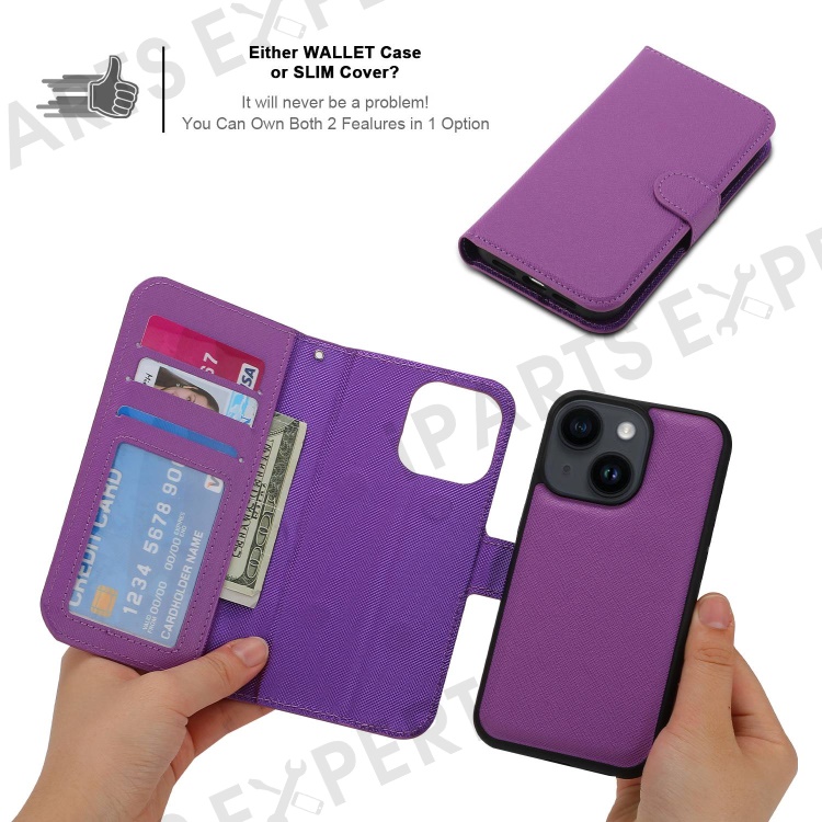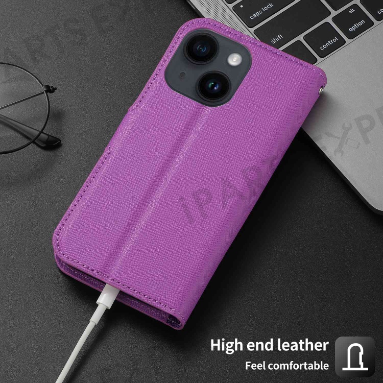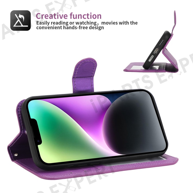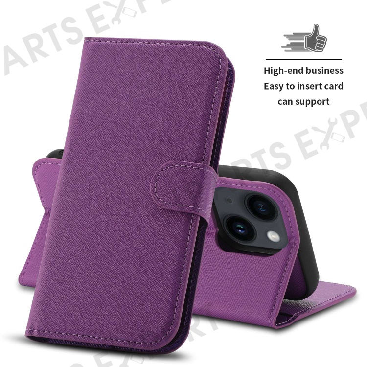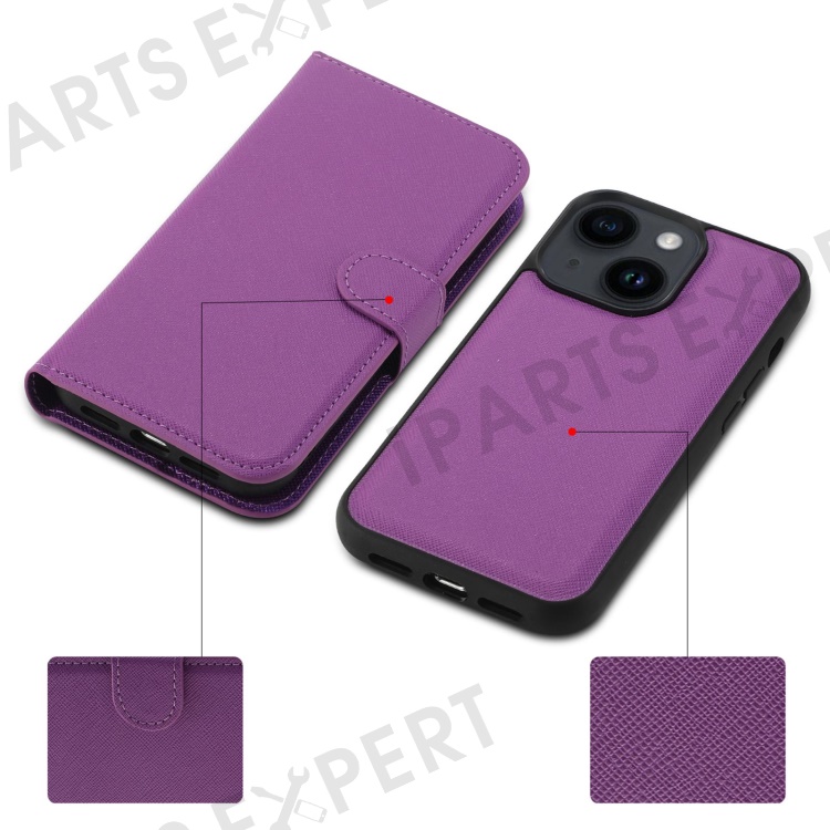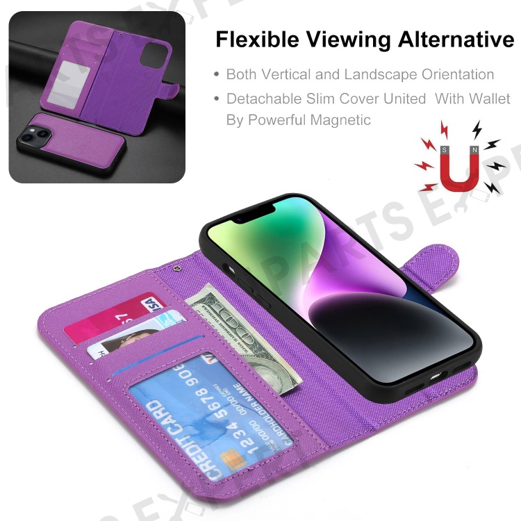 For iPhone 14 Plus Detachable TPU Back Case Cross Texture Wallet Stand PU Leather Shockproof Cover - Purple