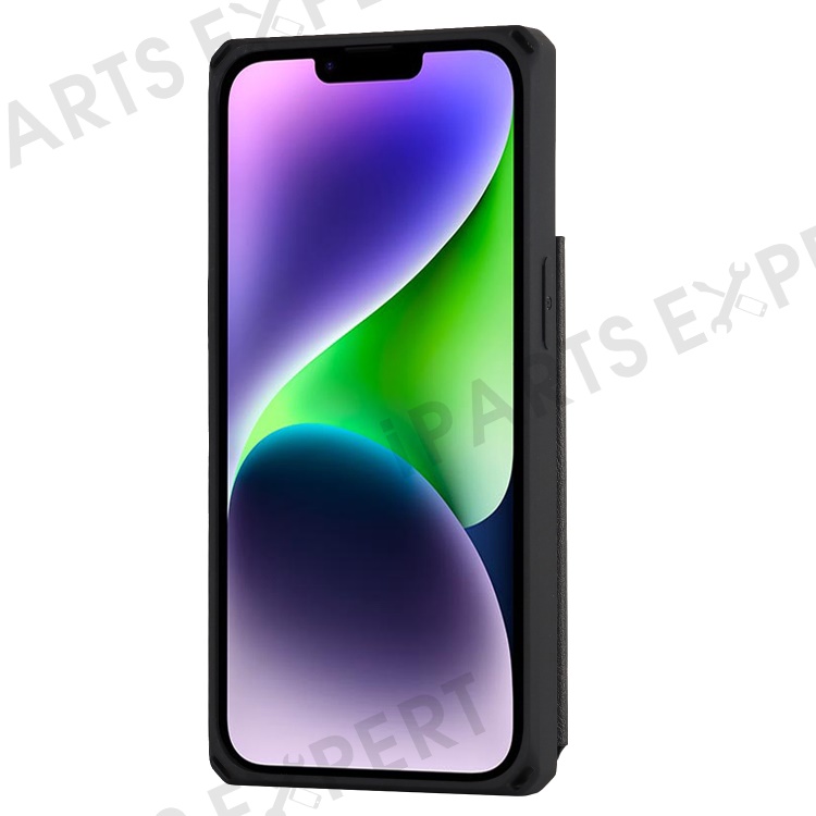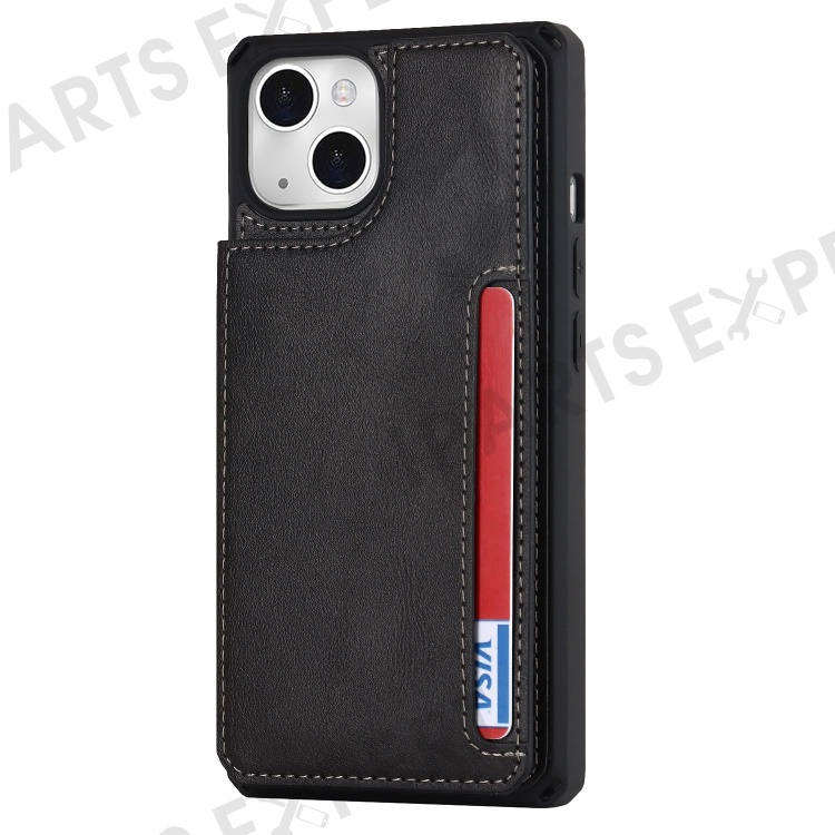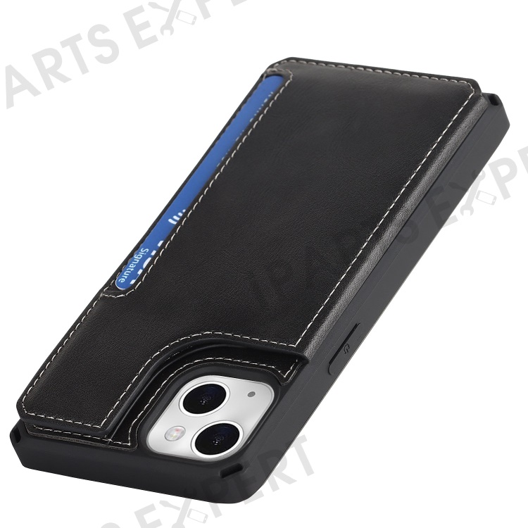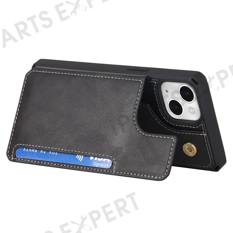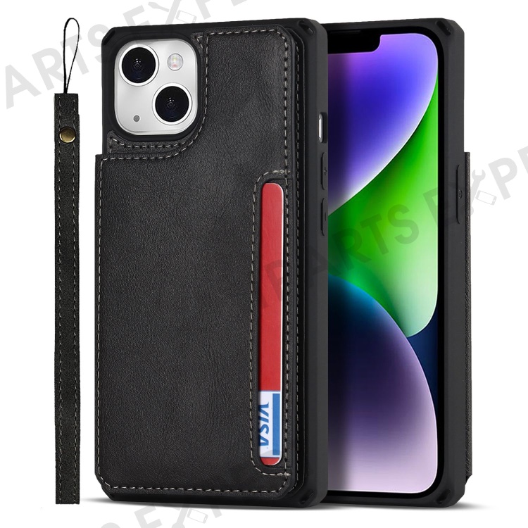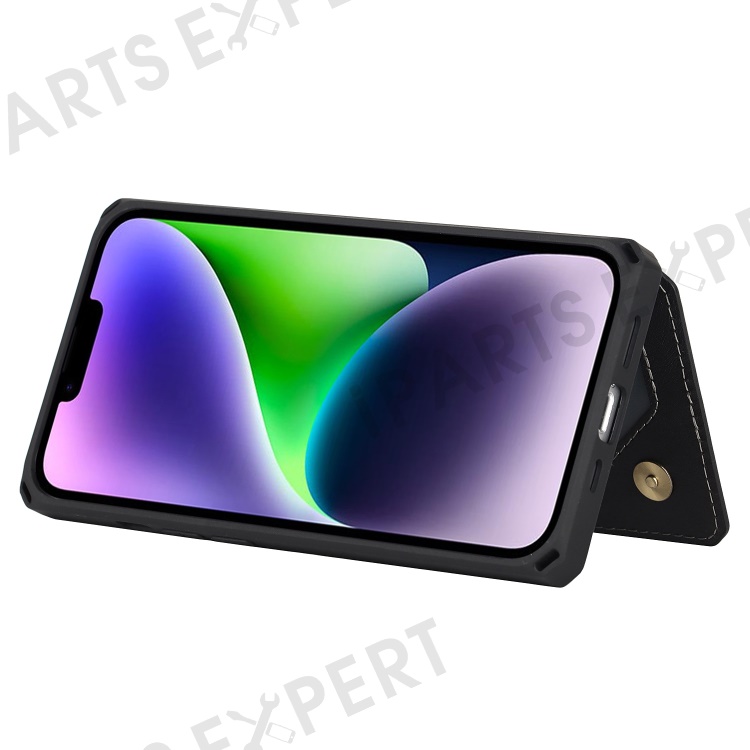 For iPhone 14 Plus Kickstand Function Magnetic Snap Button Phone Cover Shell Anti-scratch PU Leather+TPU Phone Case with Card Slot and Strap - Black
