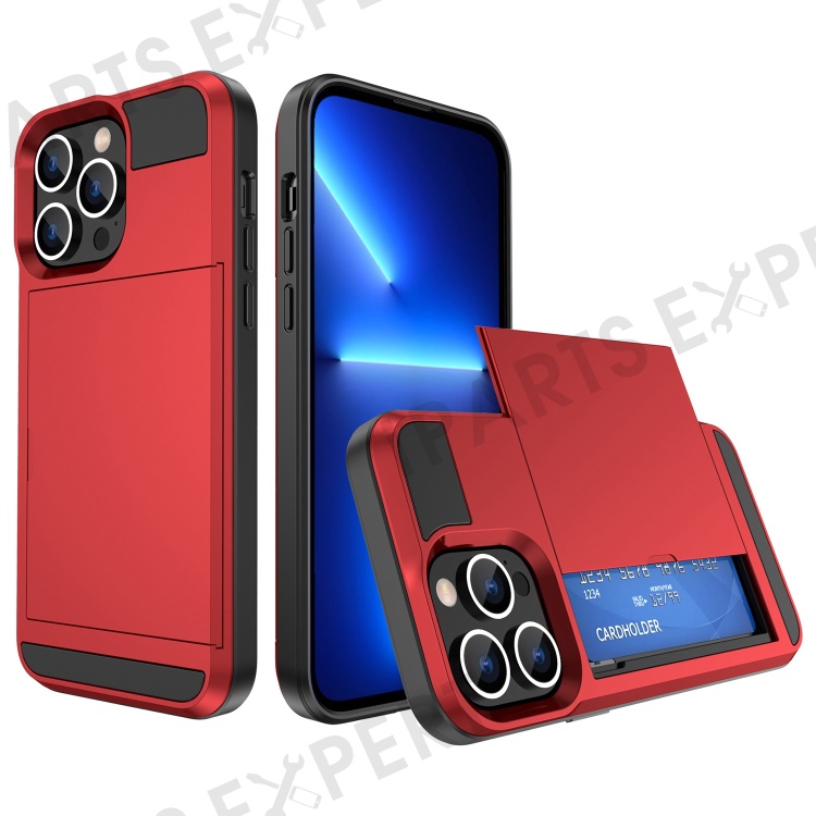 For iPhone 14 Pro 6.1 inch Anti-scratch Phone Case with Sliding Card Holder Smooth Surface PC + TPU Hybrid Phone Shell - Red