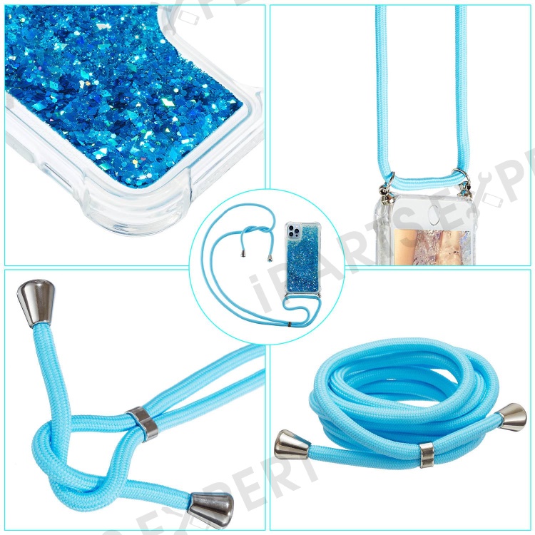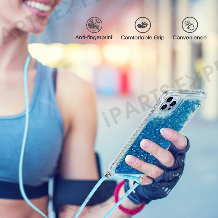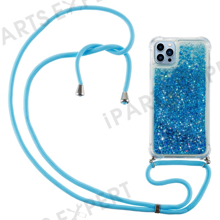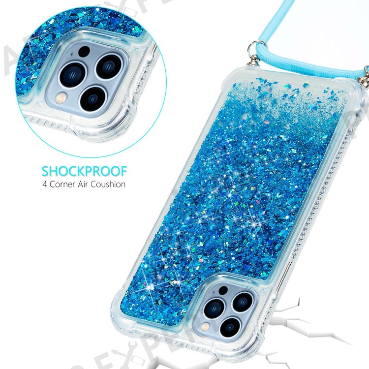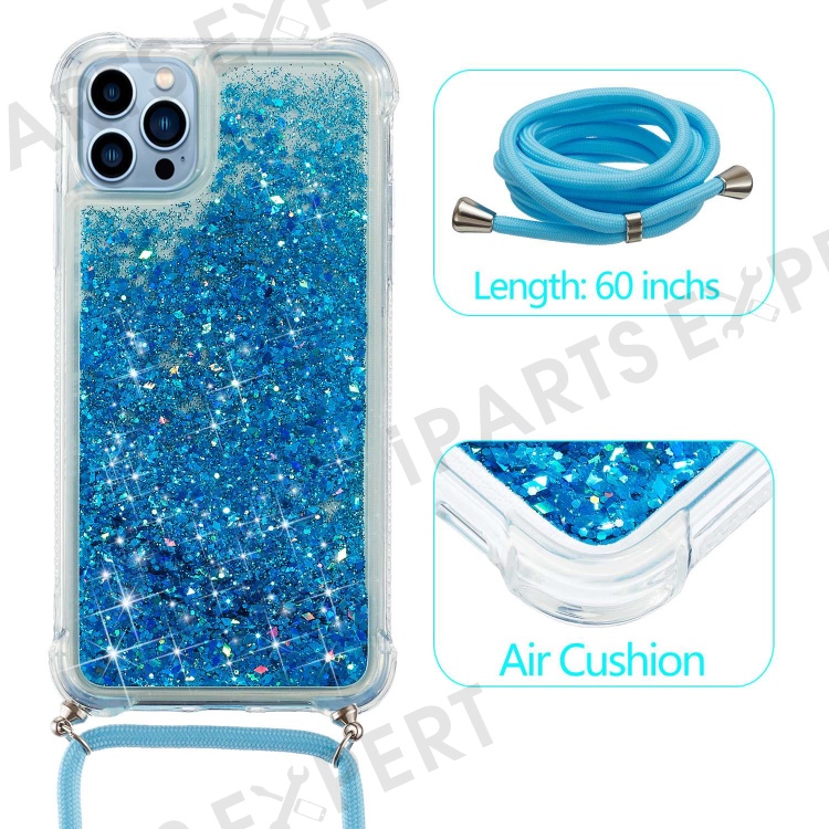 For iPhone 14 Pro 6.1 inch Bling Glitter Liquid Case Floating Quicksand Shockproof Soft TPU Phone Cover with Long Lanyard - Blue