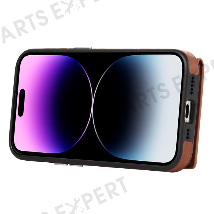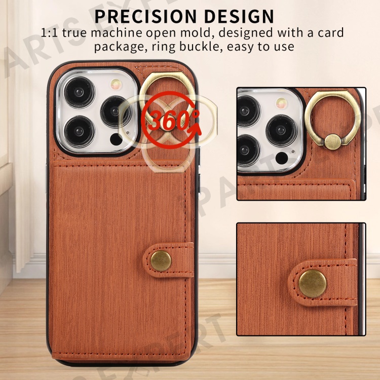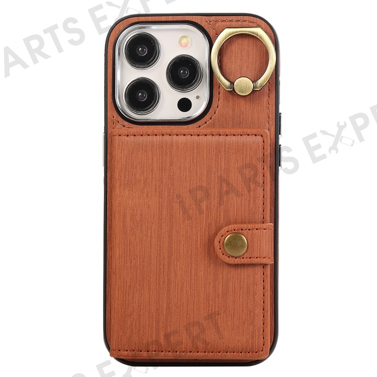 For iPhone 14 Pro Case Ring Kickstand Wallet Brushed PU Leather+TPU Phone Cover - Brown
