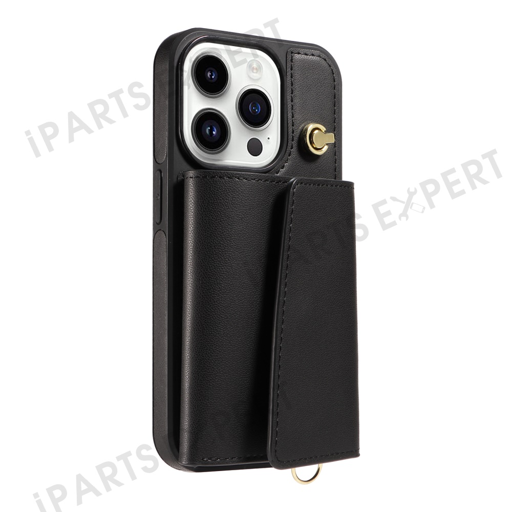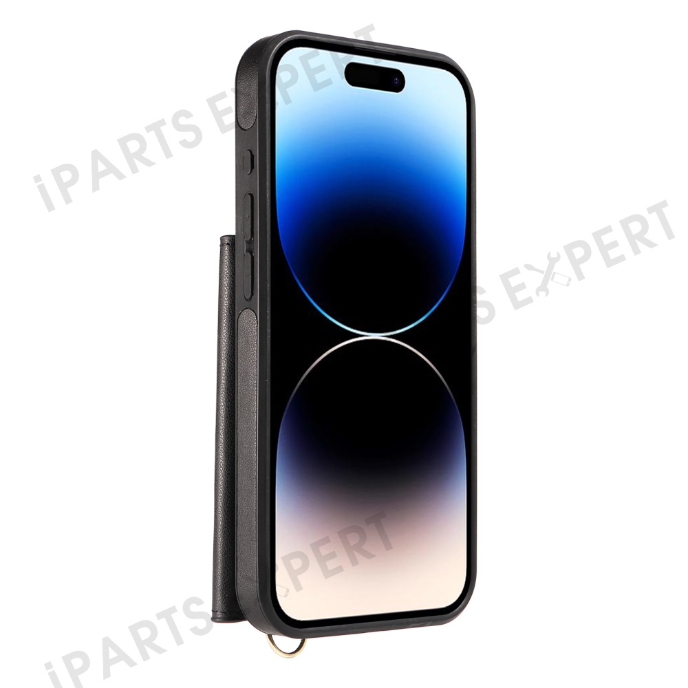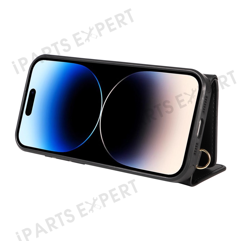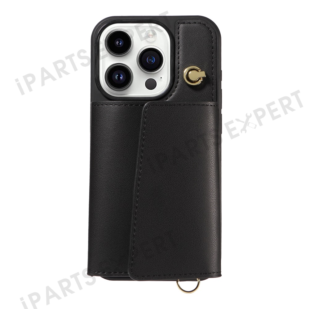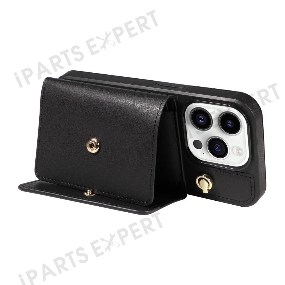 For iPhone 14 Pro Crossbody Phone Case Card Holder Kickstand Leather Coated TPU Mobile Cover - Black
