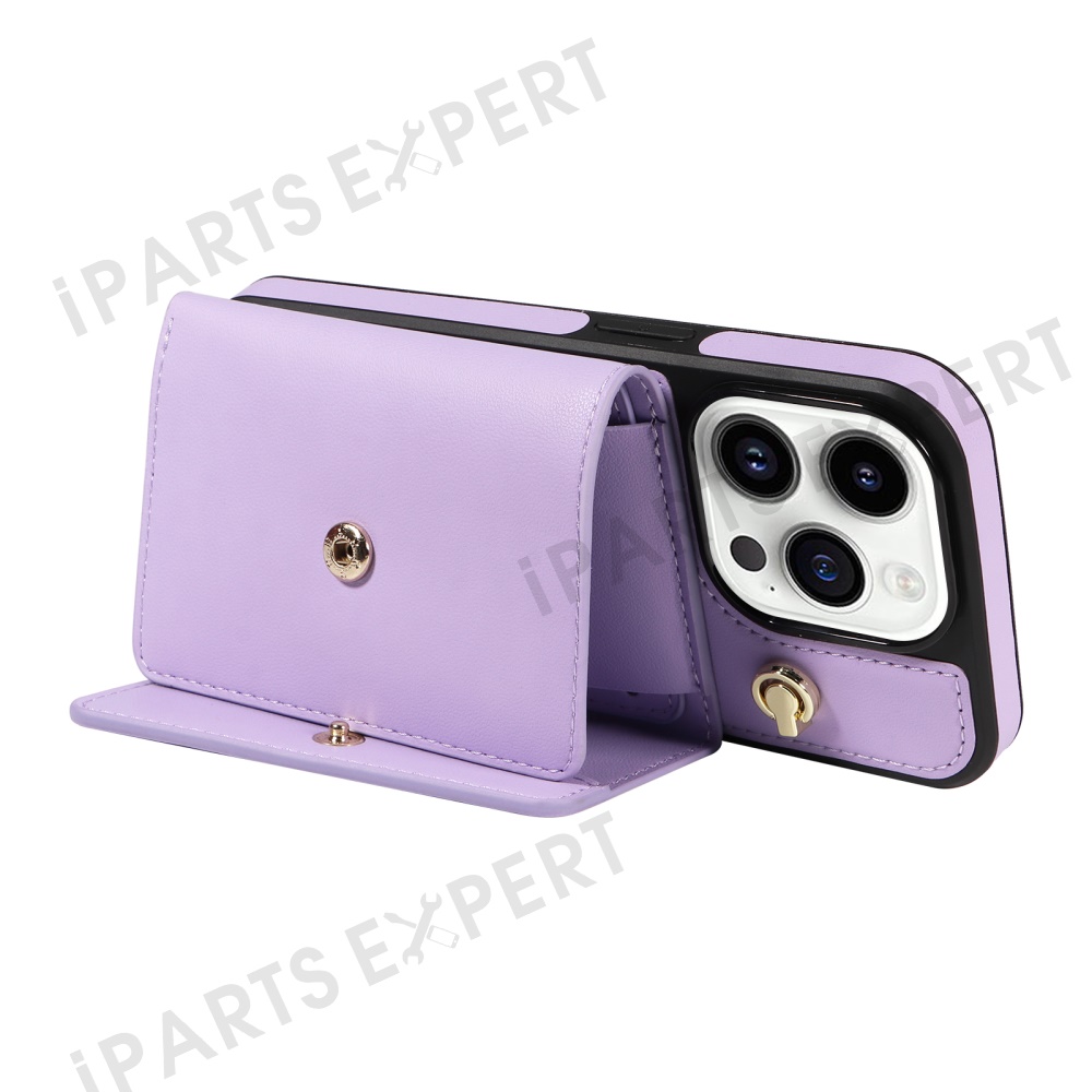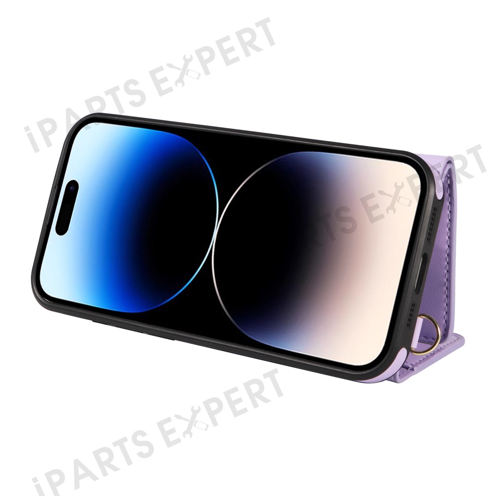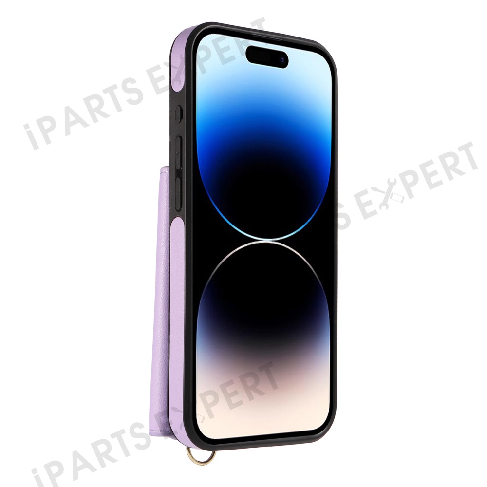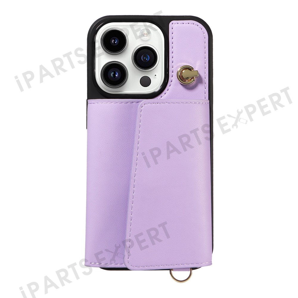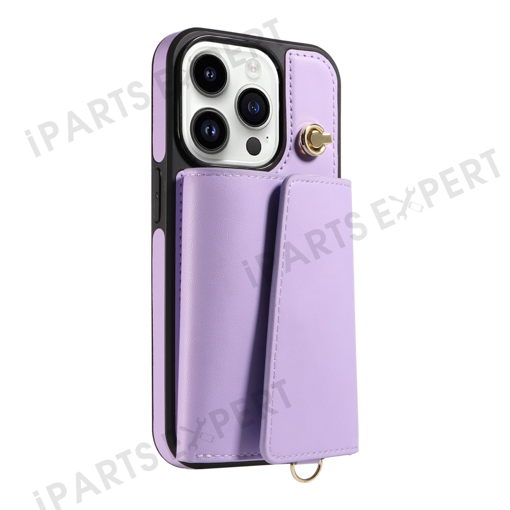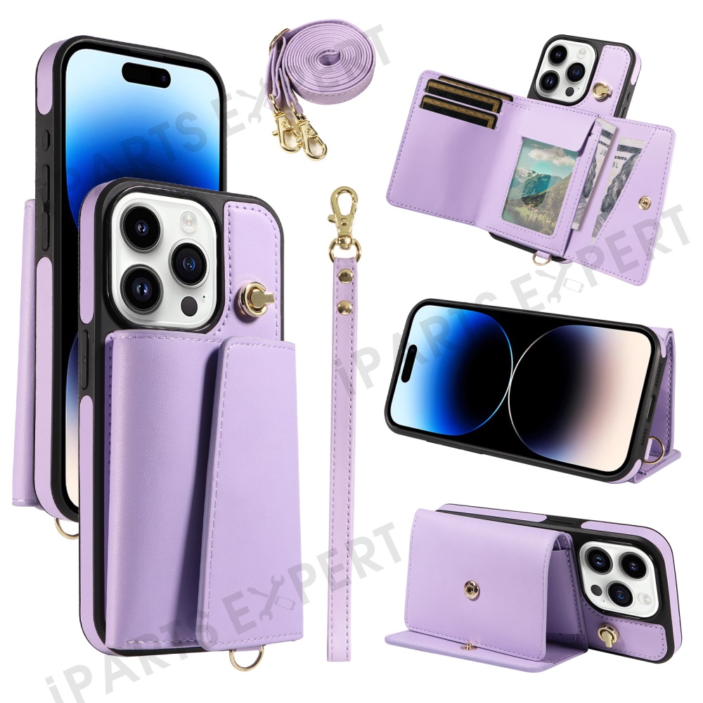 For iPhone 14 Pro Crossbody Phone Case Card Holder Kickstand Leather Coated TPU Mobile Cover - Purple