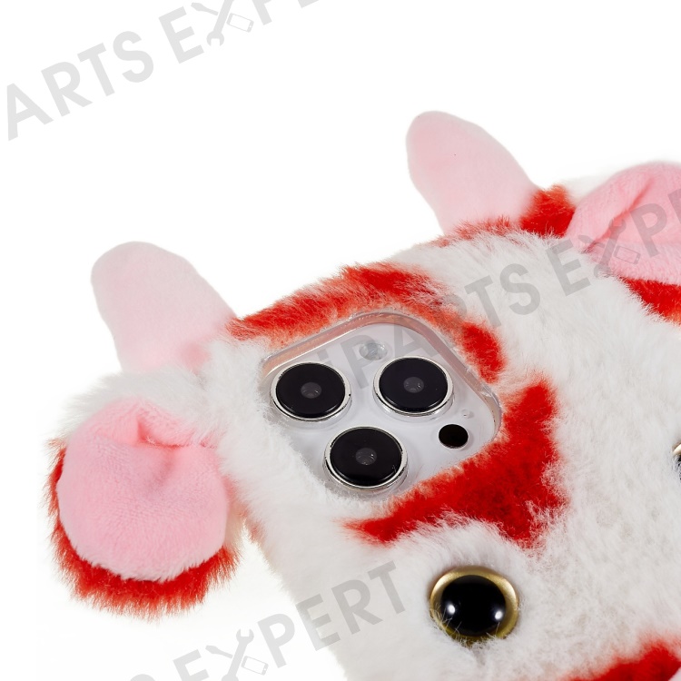 For iPhone 14 Pro Cute Milk Cow Ear Winter Furry Soft TPU Case Winter Phone Protective Shell - Red