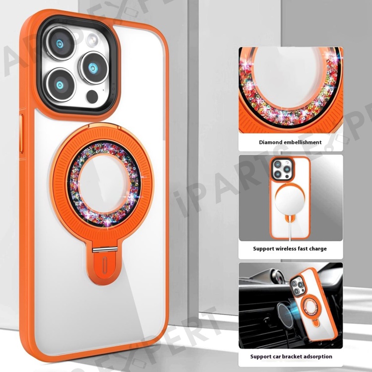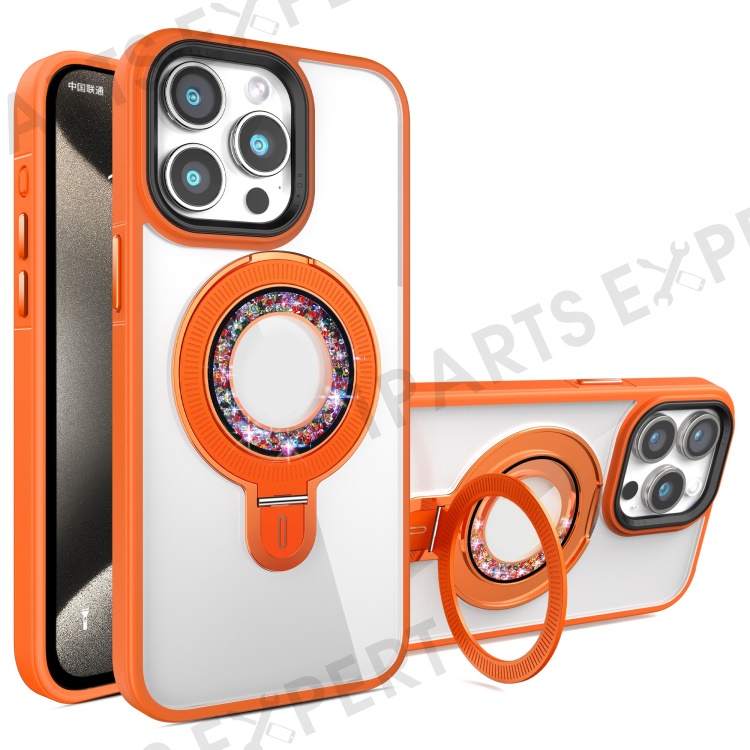 For iPhone 14 Pro Magnetic Case Rhinestone Decor Ring Kickstand PC+TPU Phone Cover - Orange