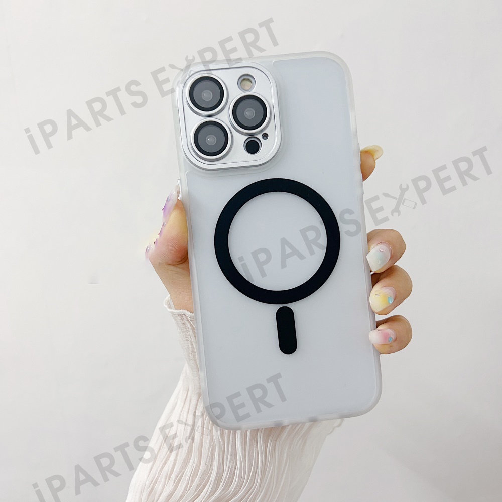 For iPhone 14 Pro Magnetic Case with Lens Film / Detachable Lens Frame Hybrid Phone Back Cover - Transparent White + Black