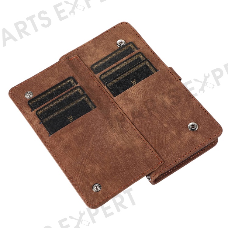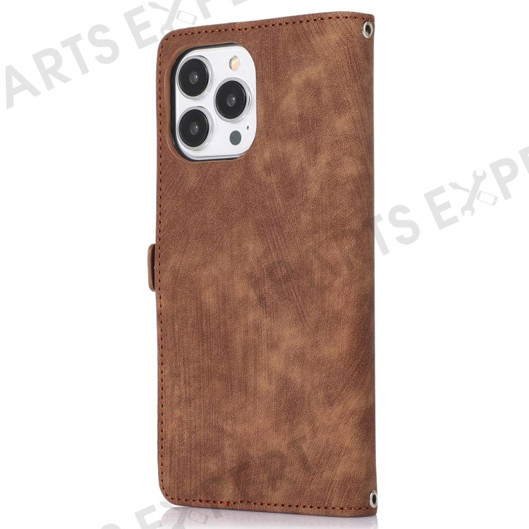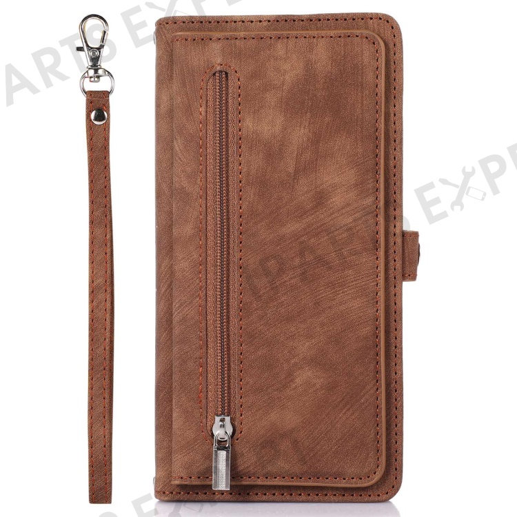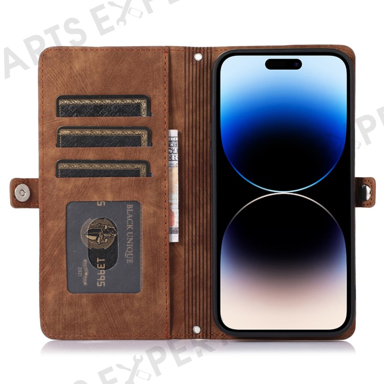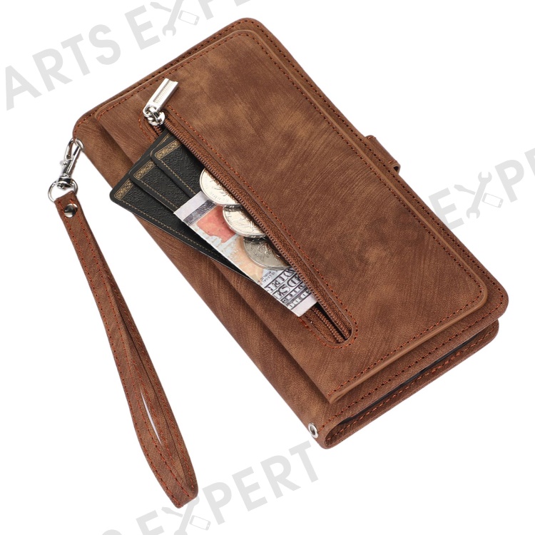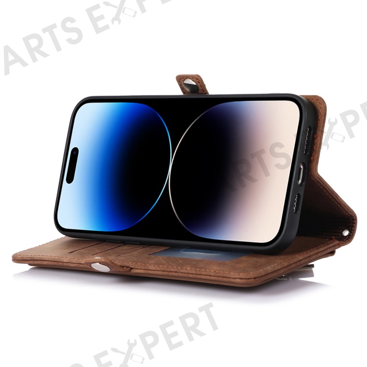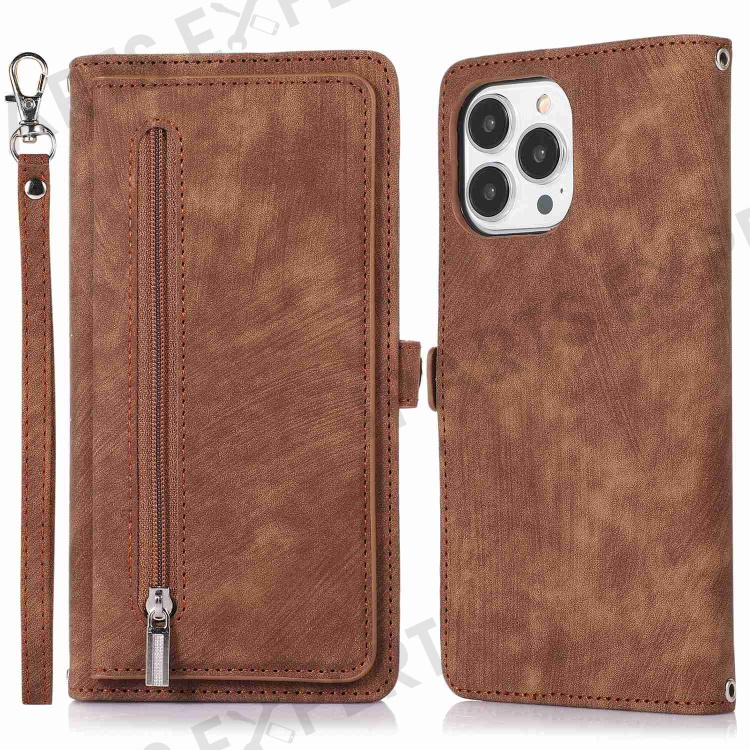 For iPhone 14 Pro Max 6.7 inch 9 Card Slots Phone Wallet Case Zipper Pocket Design Full Protection PU Leather Stand Cover with Wrist Strap - Brown