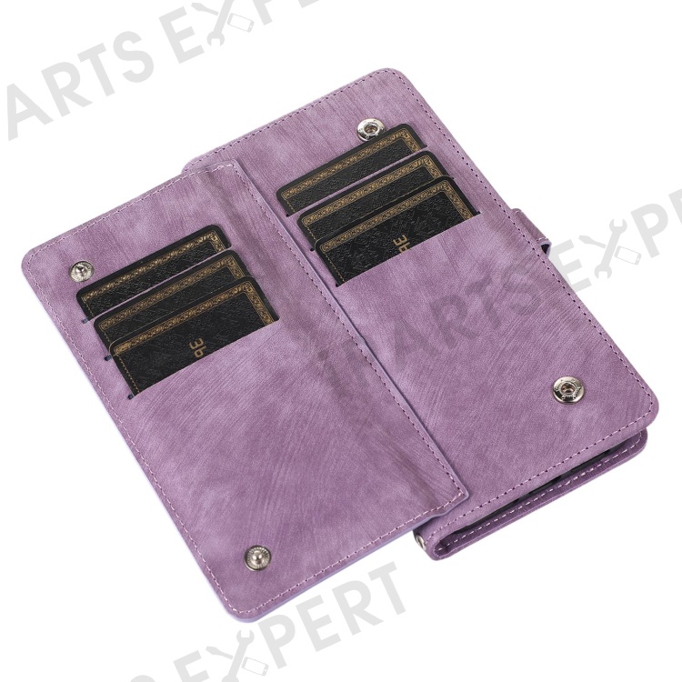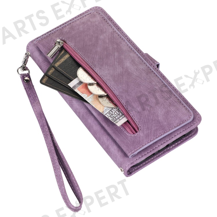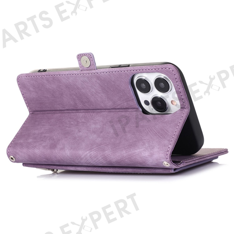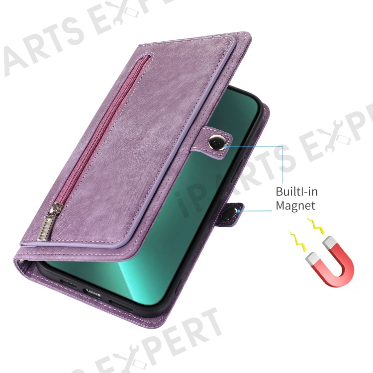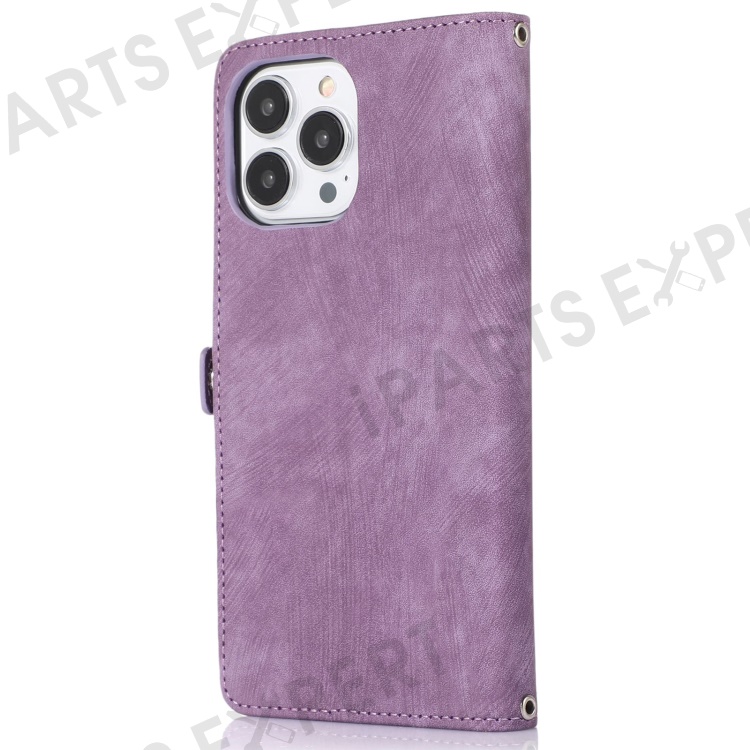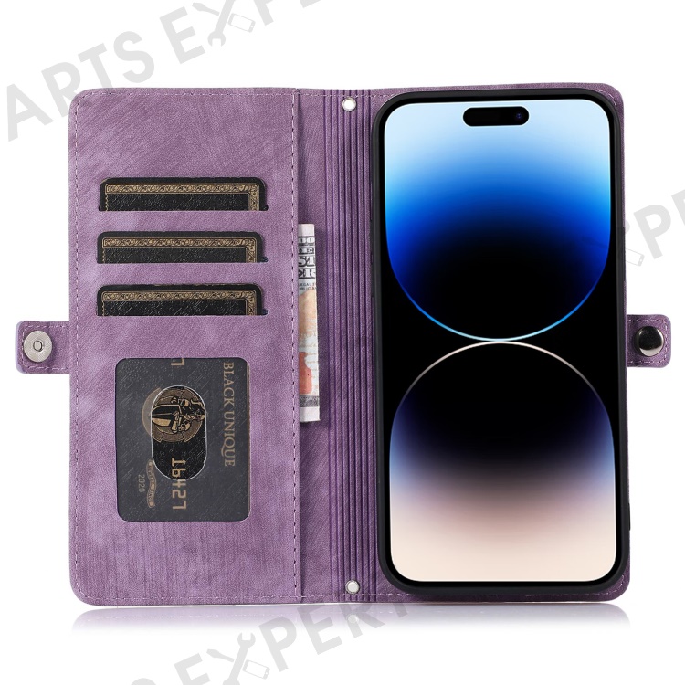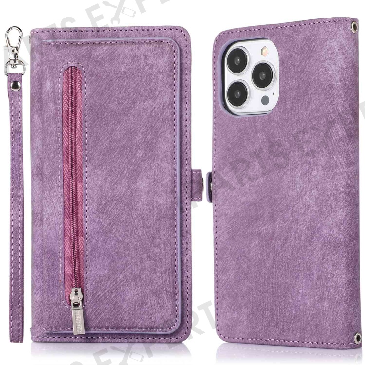 For iPhone 14 Pro Max 6.7 inch 9 Card Slots Phone Wallet Case Zipper Pocket Design Full Protection PU Leather Stand Cover with Wrist Strap - Purple