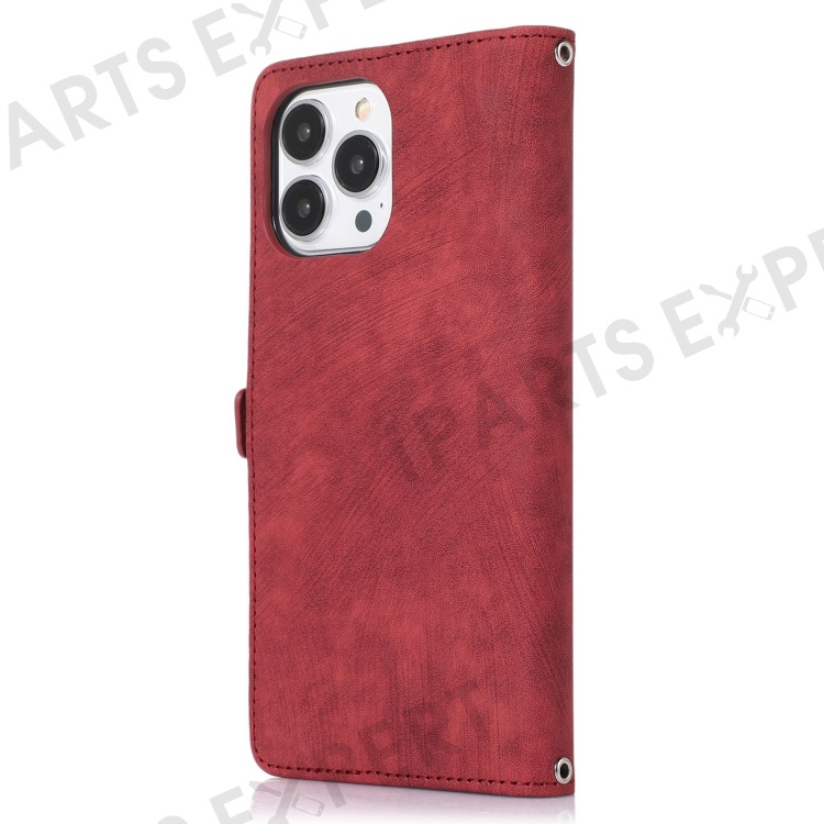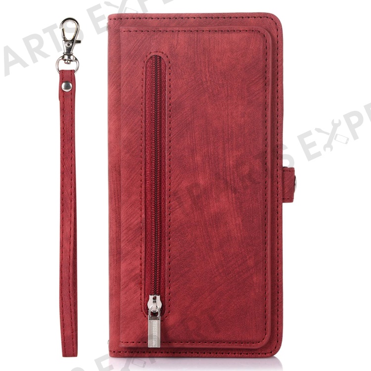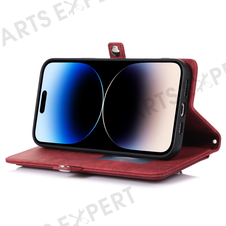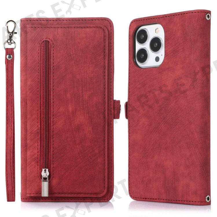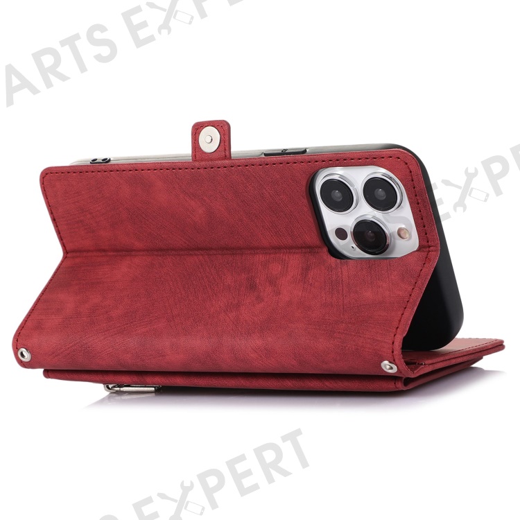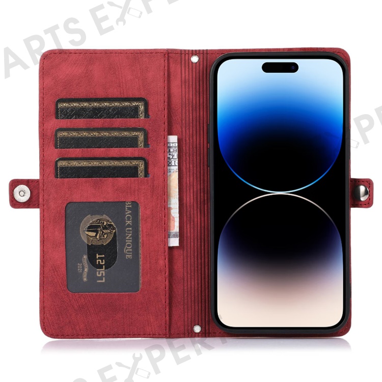 For iPhone 14 Pro Max 6.7 inch 9 Card Slots Phone Wallet Case Zipper Pocket Design Full Protection PU Leather Stand Cover with Wrist Strap - Red