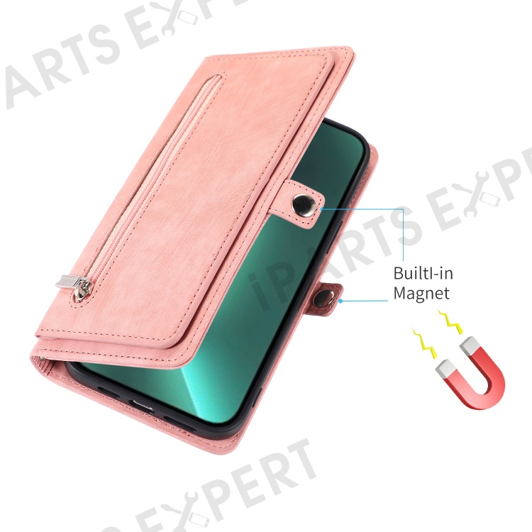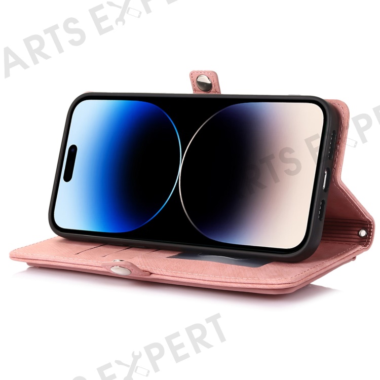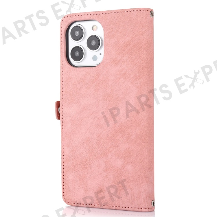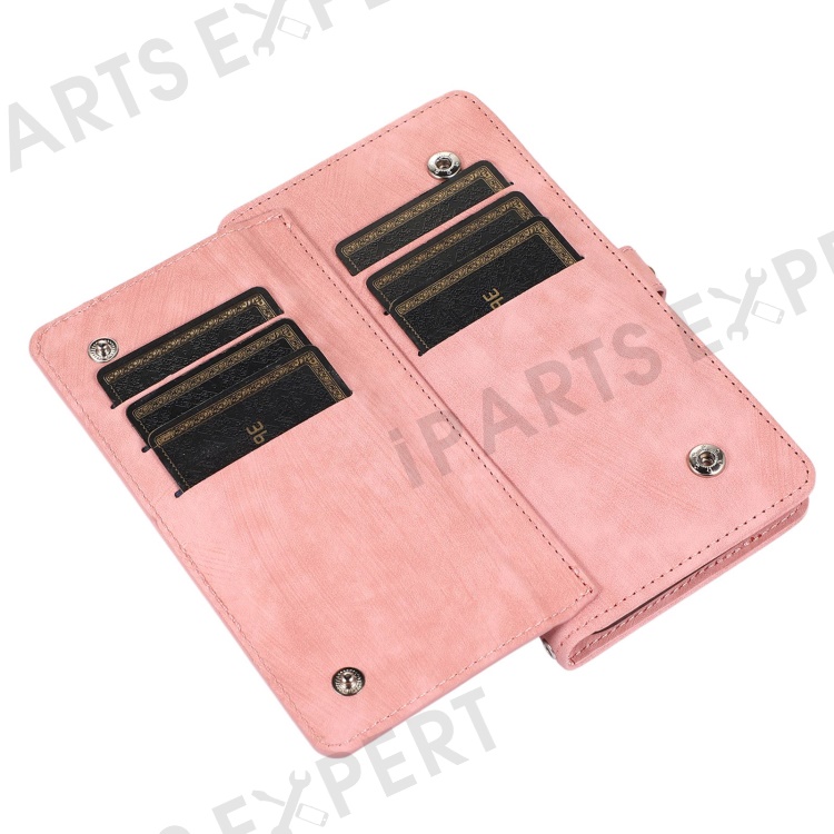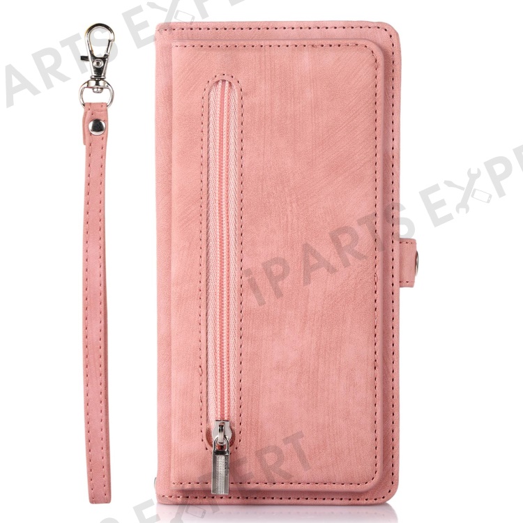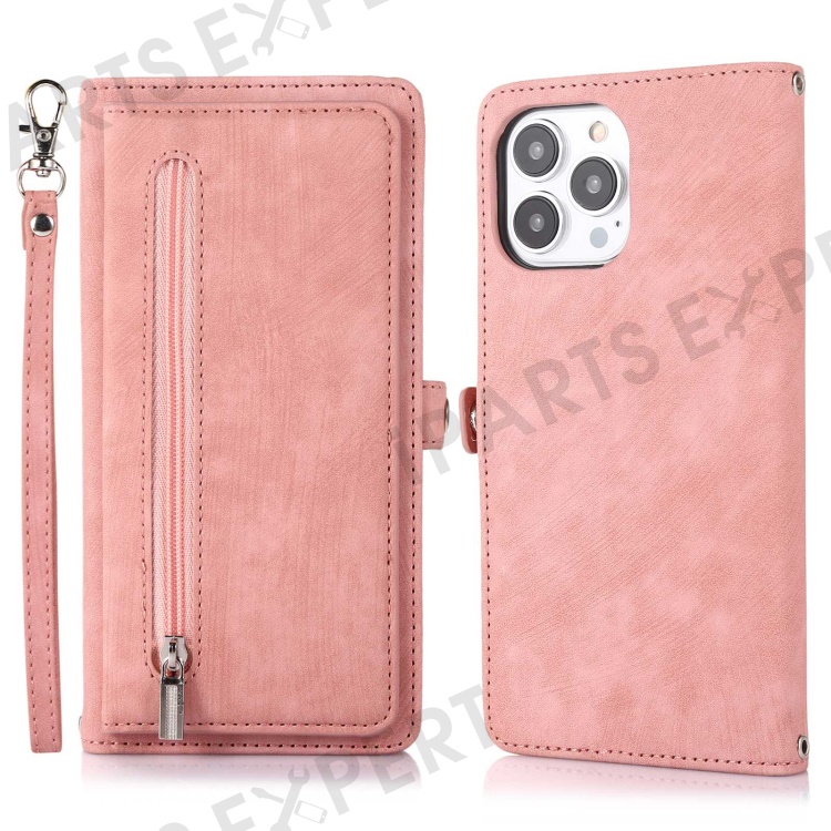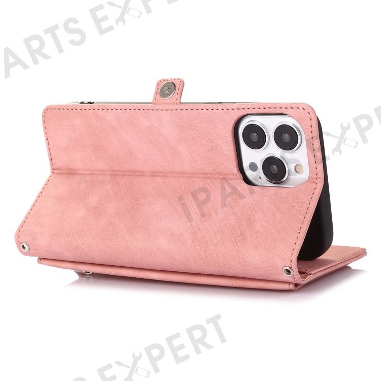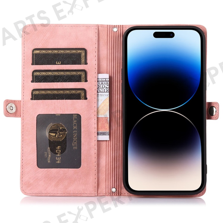 For iPhone 14 Pro Max 6.7 inch 9 Card Slots Phone Wallet Case Zipper Pocket Design Full Protection PU Leather Stand Cover with Wrist Strap - Rose Gold