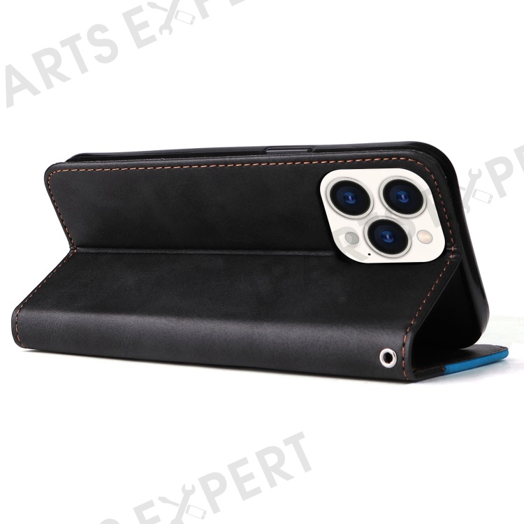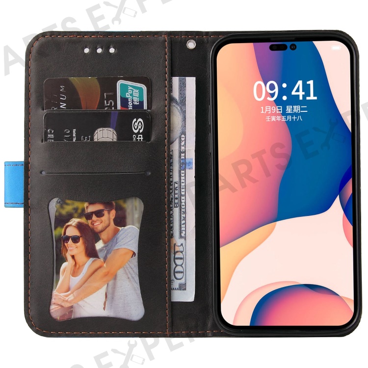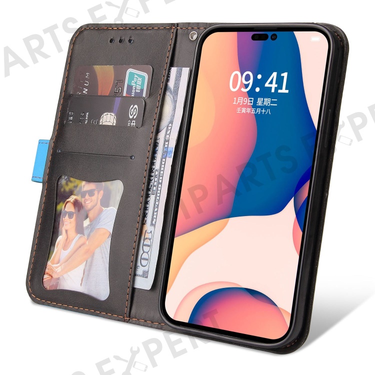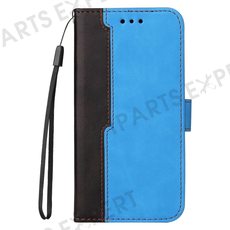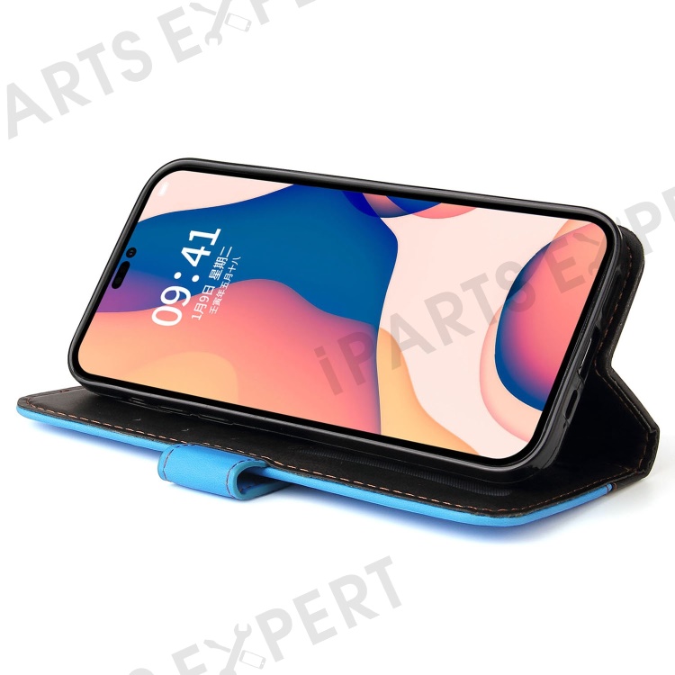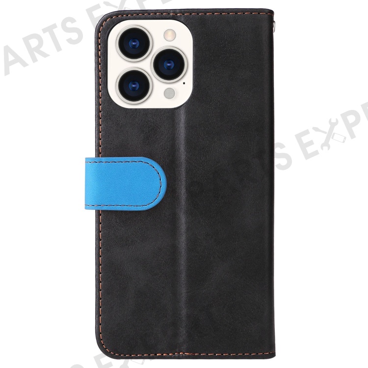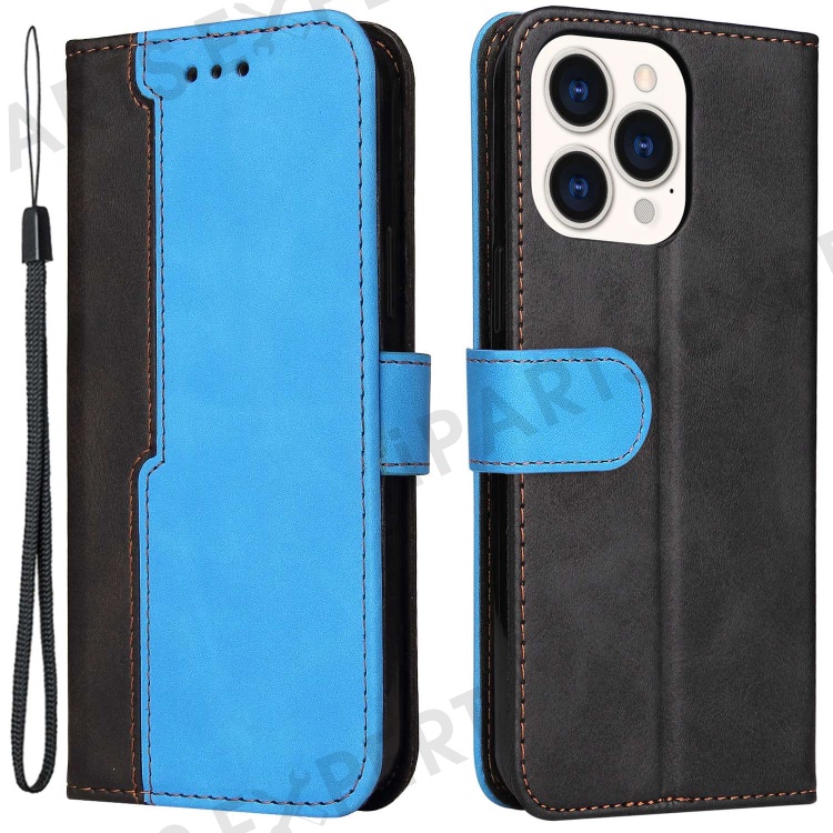 For iPhone 14 Pro Max 6.7 inch Business Style PU Leather Dual-Color Splicing Phone Wallet Cover Flip Stand Anti-Drop Case - Blue