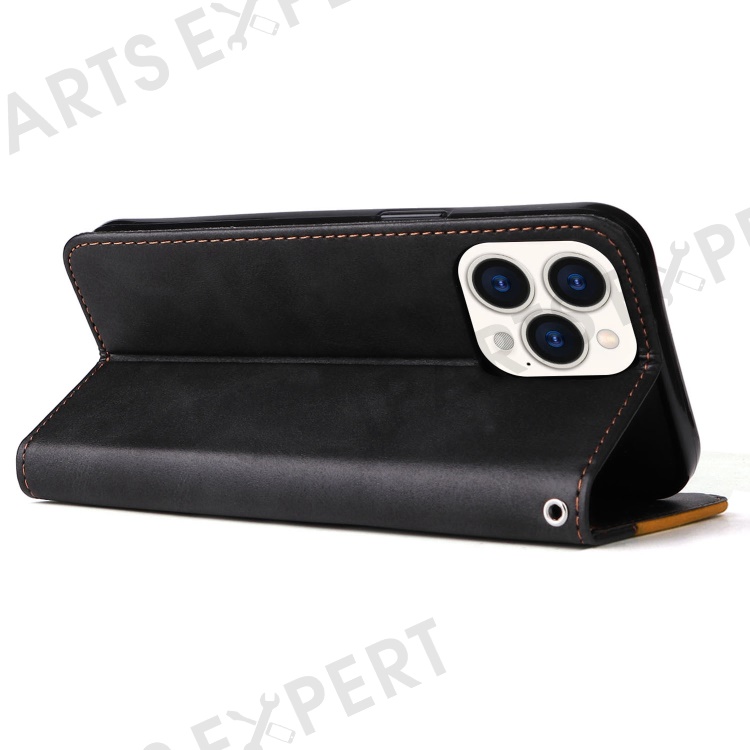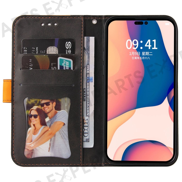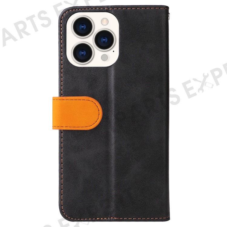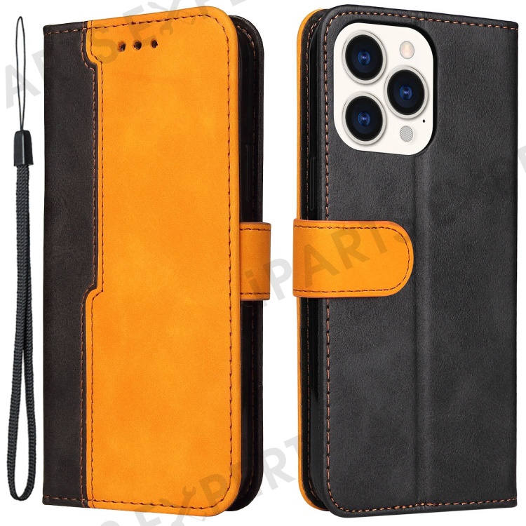 For iPhone 14 Pro Max 6.7 inch Business Style PU Leather Dual-Color Splicing Phone Wallet Cover Flip Stand Anti-Drop Case - Orange