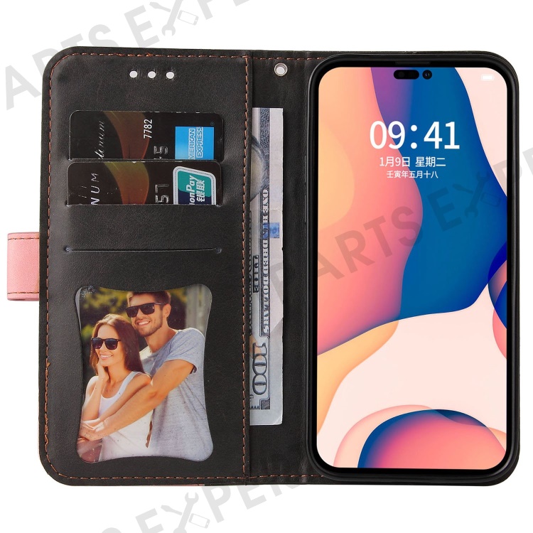 For iPhone 14 Pro Max 6.7 inch Business Style PU Leather Dual-Color Splicing Phone Wallet Cover Flip Stand Anti-Drop Case - Pink