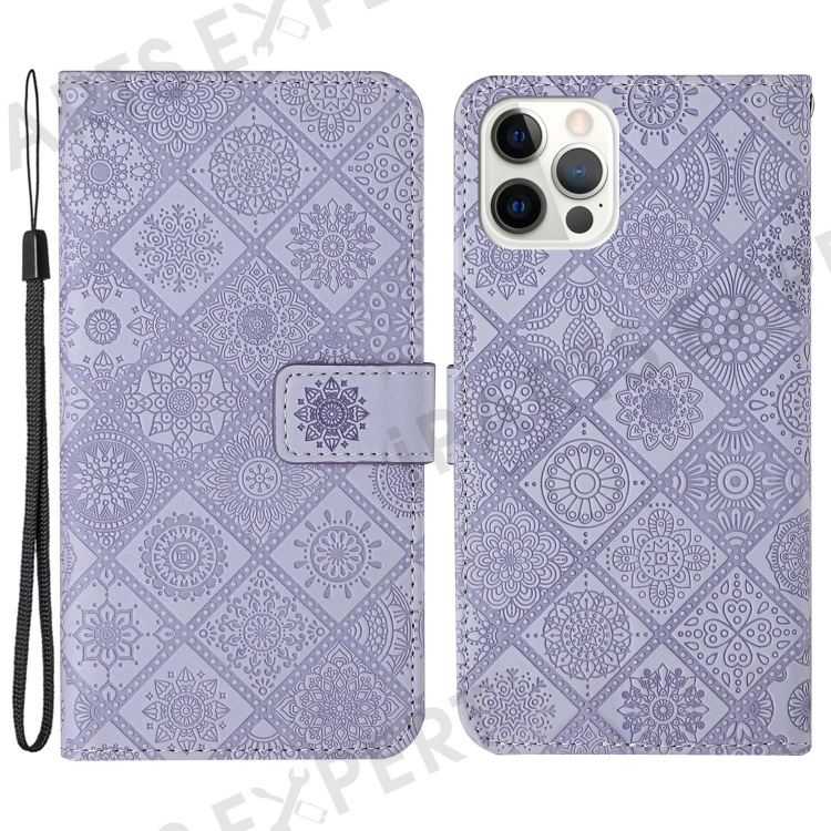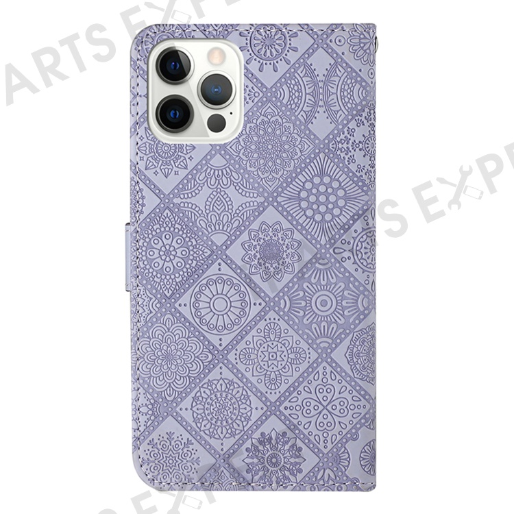 For iPhone 14 Pro Max 6.7 inch Ethnic Style Flower Imprinted Case PU Leather+TPU Stand Wallet Mobile Phone Cover - Purple