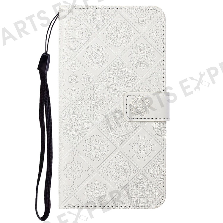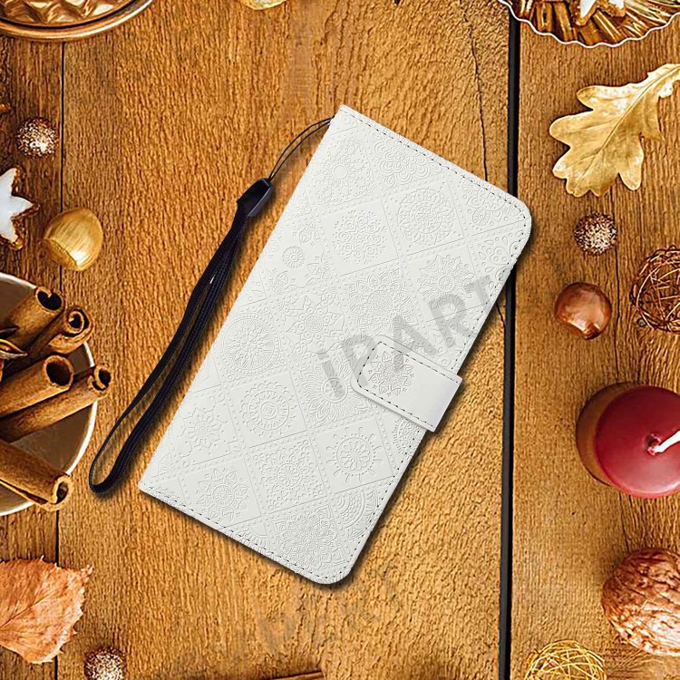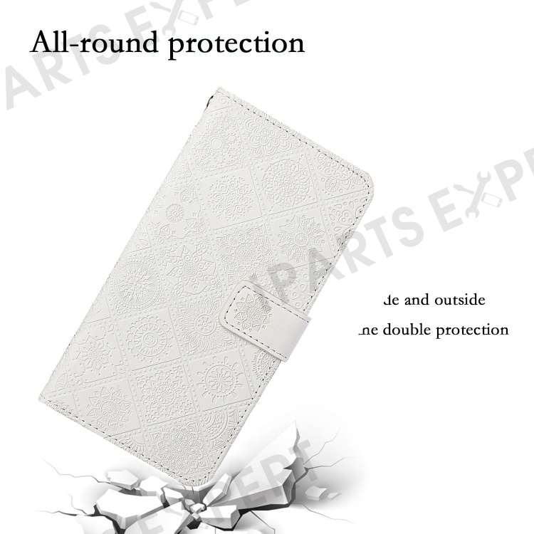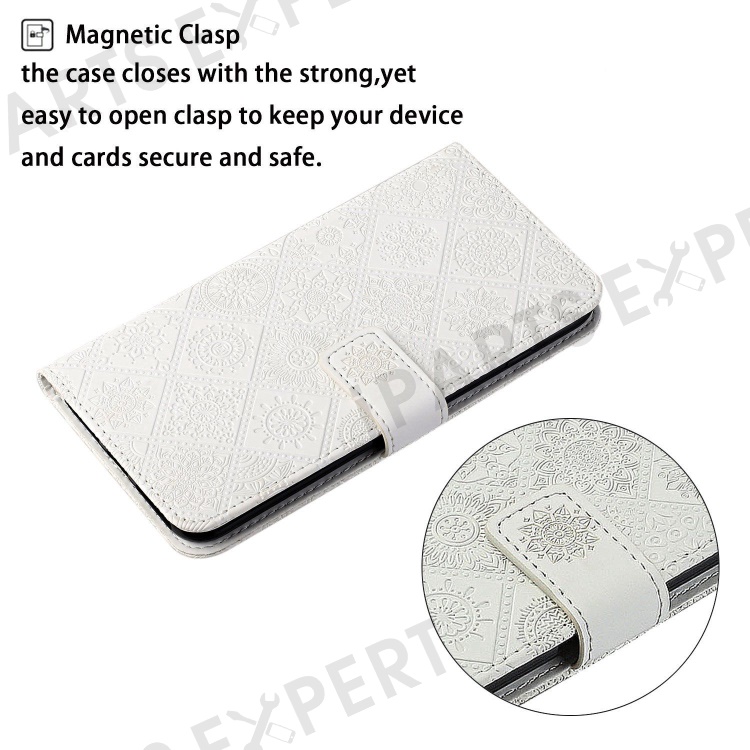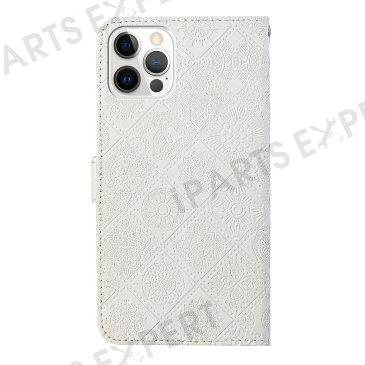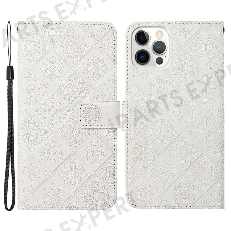 For iPhone 14 Pro Max 6.7 inch Ethnic Style Flower Imprinted Case PU Leather+TPU Stand Wallet Mobile Phone Cover - White