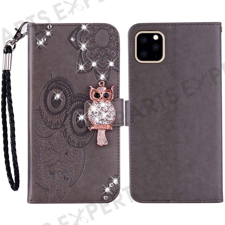For iPhone 14 Pro Max 6.7 inch Owl Flower Imprinted Wallet Stand Phone Case PU Leather Rhinestone Decor Folio Flip Cover - Grey