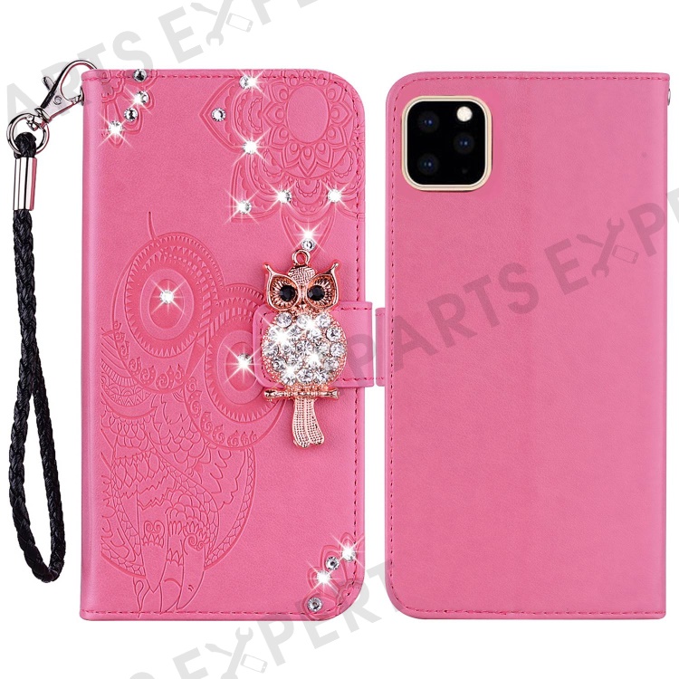 For iPhone 14 Pro Max 6.7 inch Owl Flower Imprinted Wallet Stand Phone Case PU Leather Rhinestone Decor Folio Flip Cover - Rose