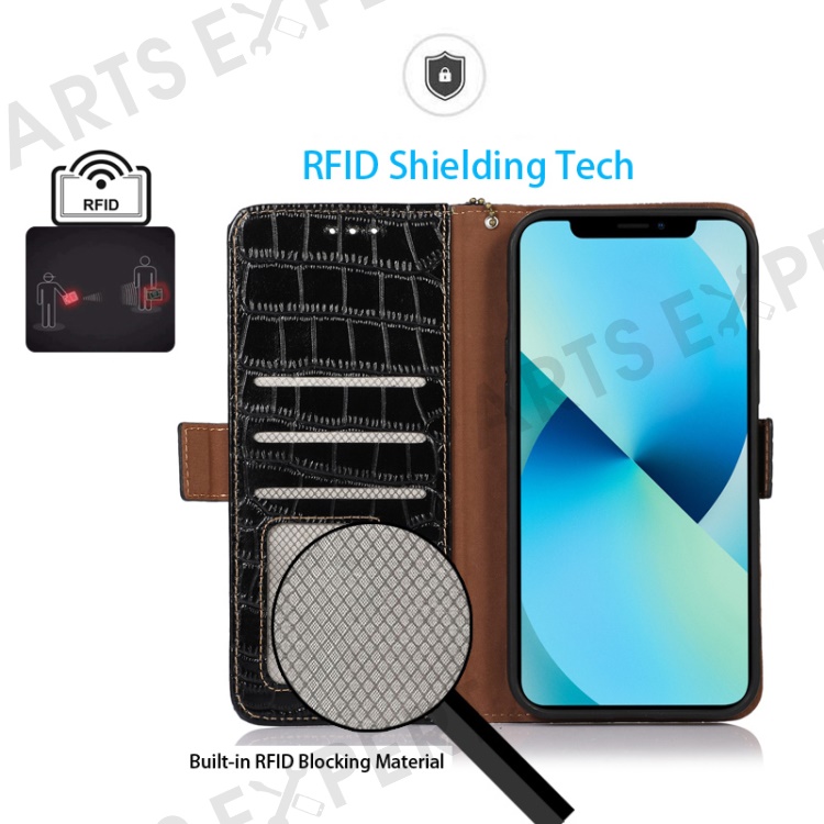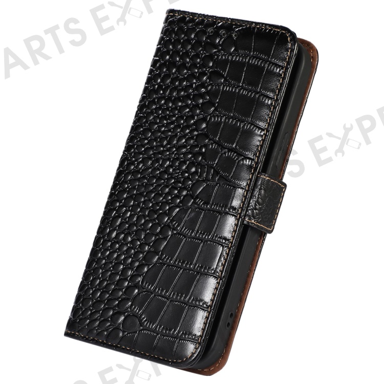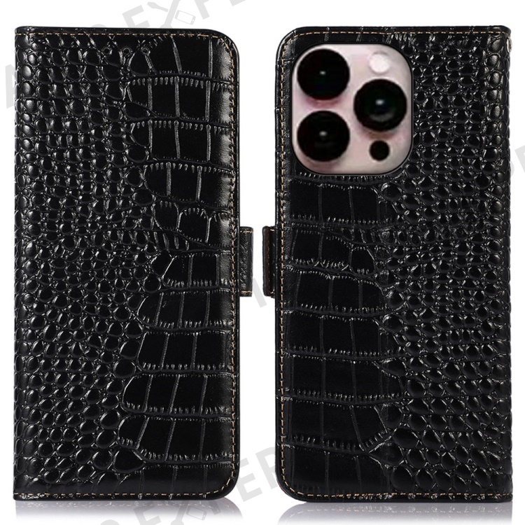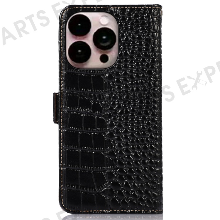 For iPhone 14 Pro Max 6.7 inch RFID Blocking Genuine Cowhide Leather Phone Case Crocodile Texture Stand Wallet Protective Cover - Black