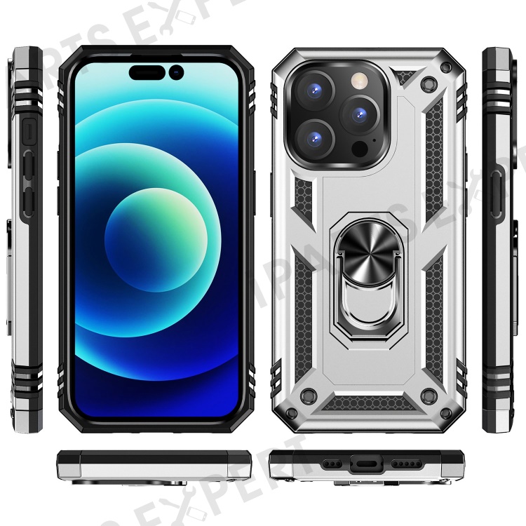 For iPhone 14 Pro Max 6.7 inch Rotary Kickstand Phone Case Soft TPU Hard PC Back Cover with Built-in Metal Sheet - Silver