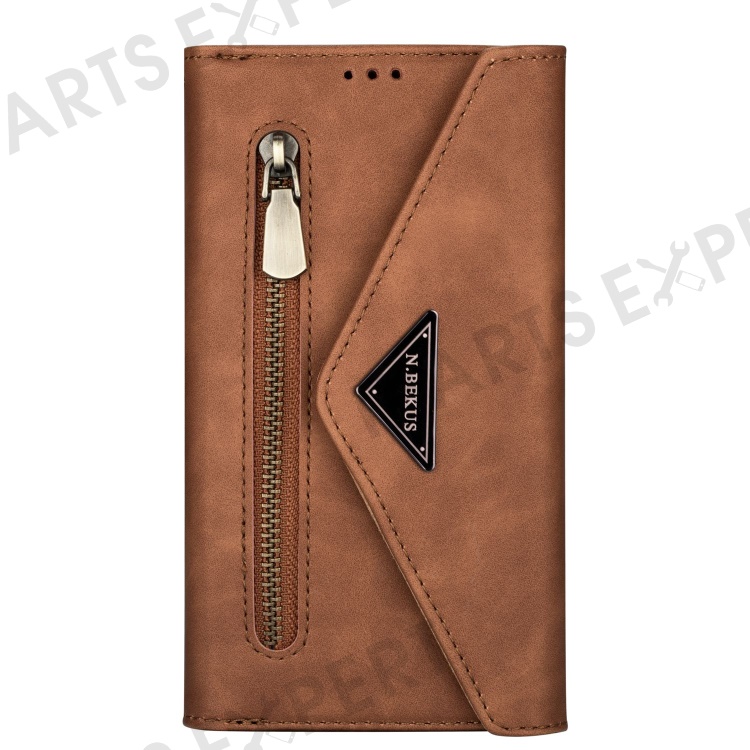 For iPhone 14 Pro Max 6.7 inch Shock Absorption Phone Case PU Leather Skin-touch Feeling Zipper Wallet Stand Cover with Short + Long Strap - Brown