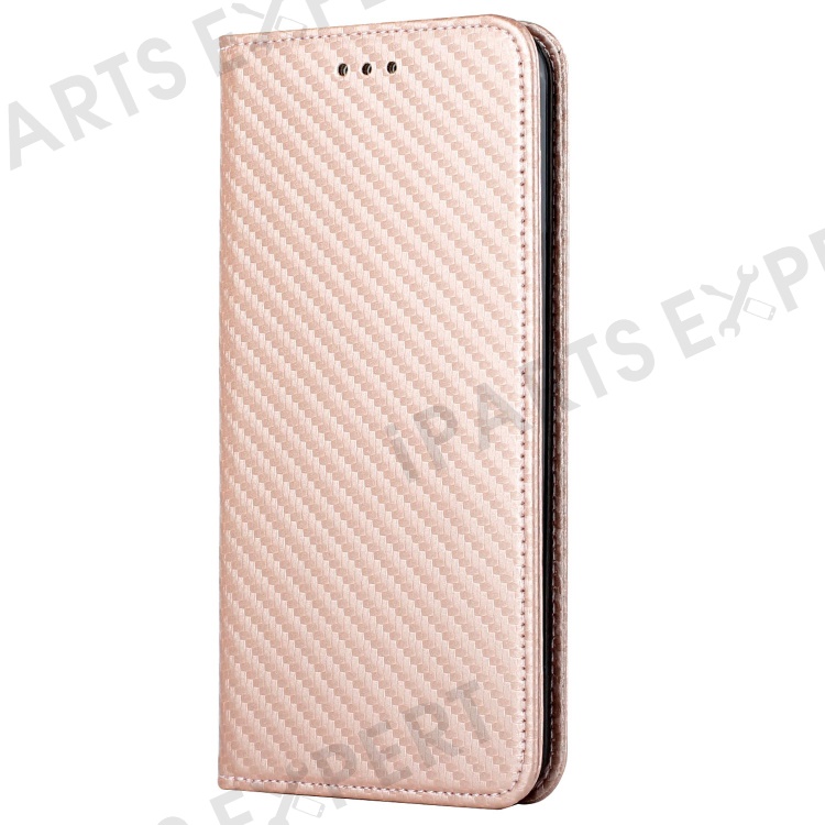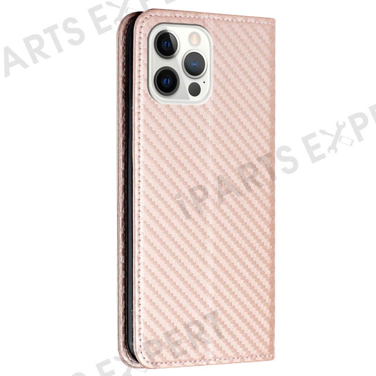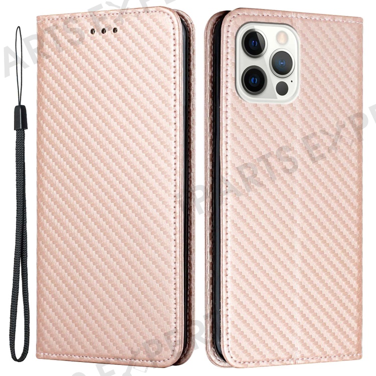 For iPhone 14 Pro Max 6.7 inch Well-protected Carbon Fiber Texture PU Leather Case Auto Magnetic Closed Flip Stand Wallet Cover - Rose Gold
