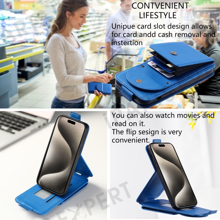 - Vertical-flip type phone case, opens down for easy operation with one hand