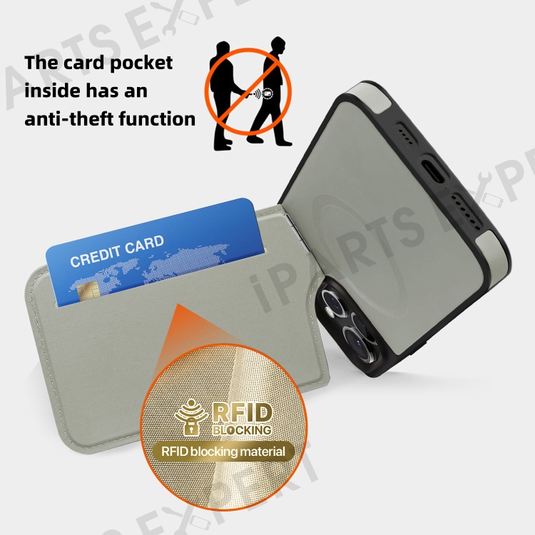 For iPhone 14 Pro Max Case Compatible with MagSafe RFID Blocking Card Slot Leather Back Cover - Grey