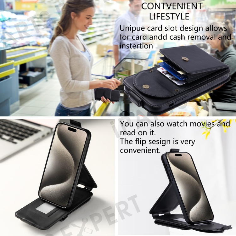 - Vertical-flip type phone case, opens down for easy operation with one hand