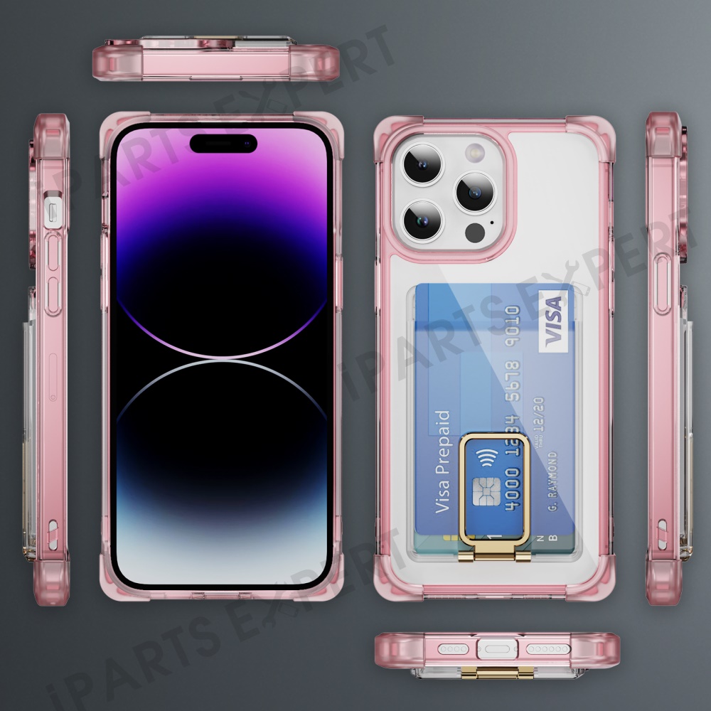 For iPhone 14 Pro Max Case Reinforced Corners TPU + Acrylic Phone Cover with Kickstand Card Holder - Transparent Pink