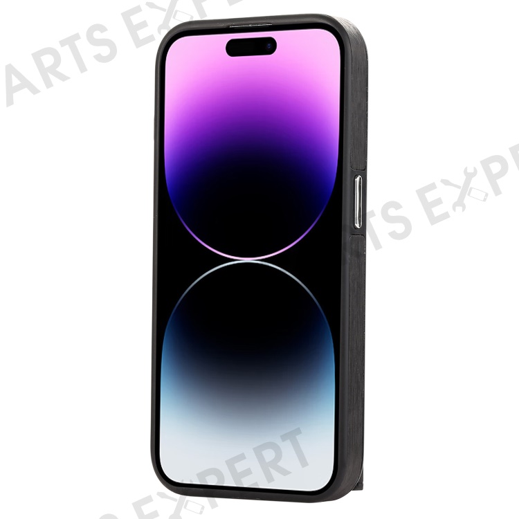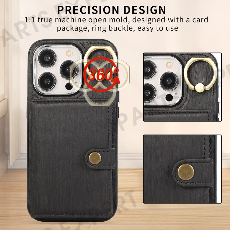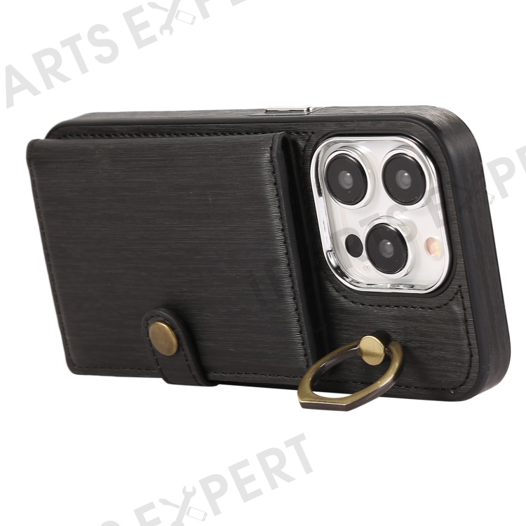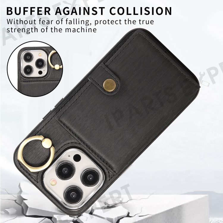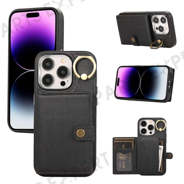 For iPhone 14 Pro Max Case Ring Kickstand Brushed PU Leather+TPU Anti-drop Phone Cover - Black