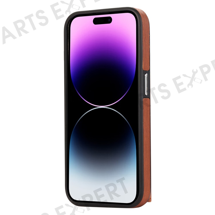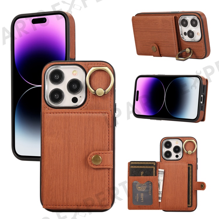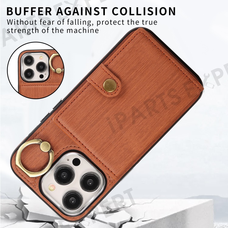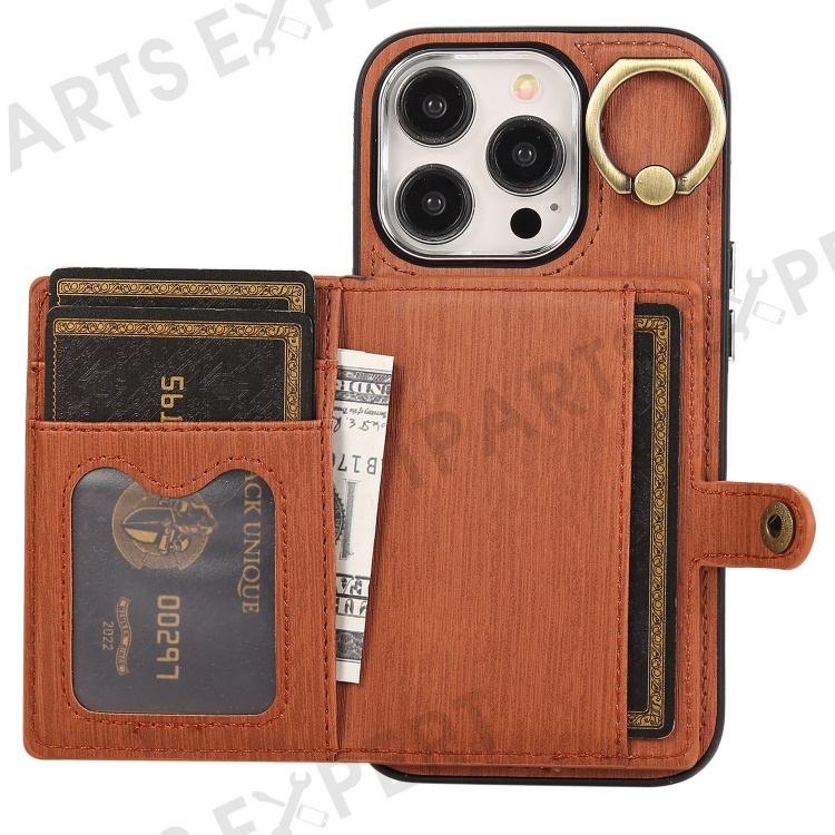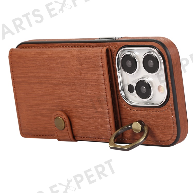 For iPhone 14 Pro Max Case Ring Kickstand Brushed PU Leather+TPU Anti-drop Phone Cover - Brown