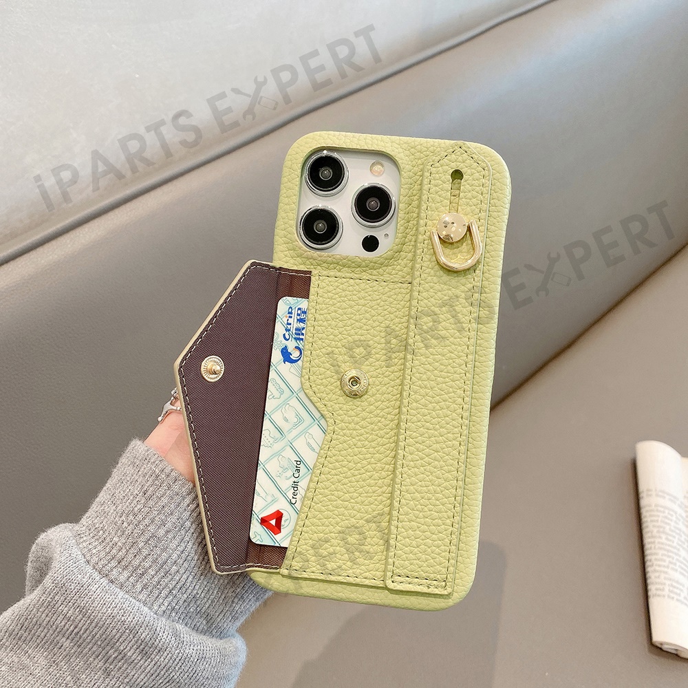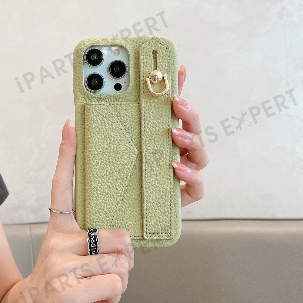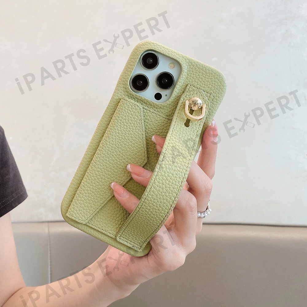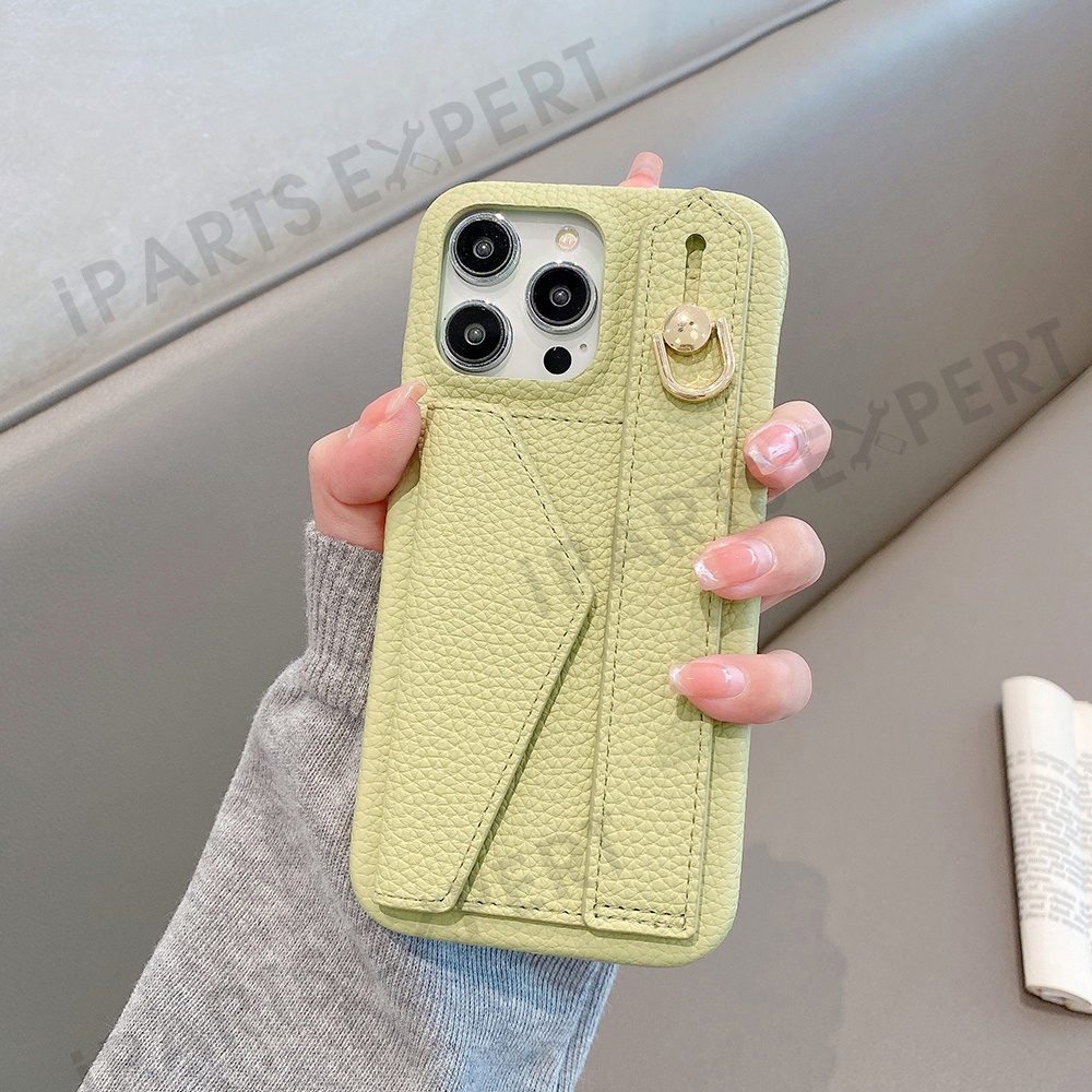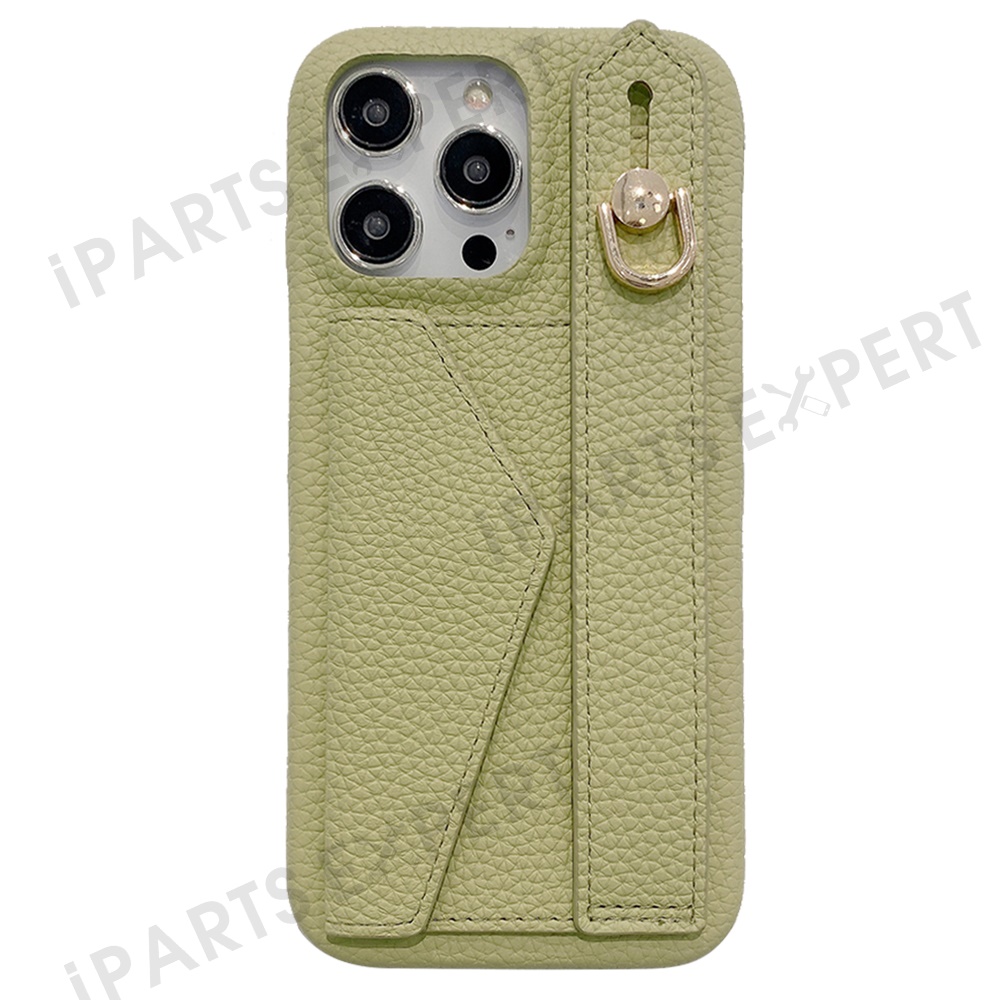 For iPhone 14 Pro Max Case with Card Slot Wristband Kickstand PU Leather+PET Phone Cover - Green